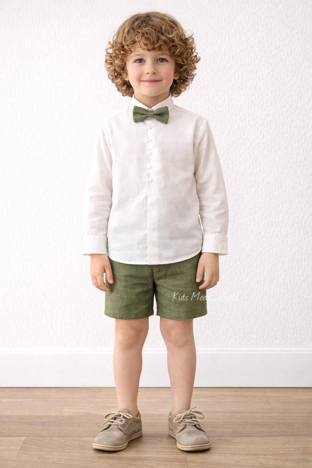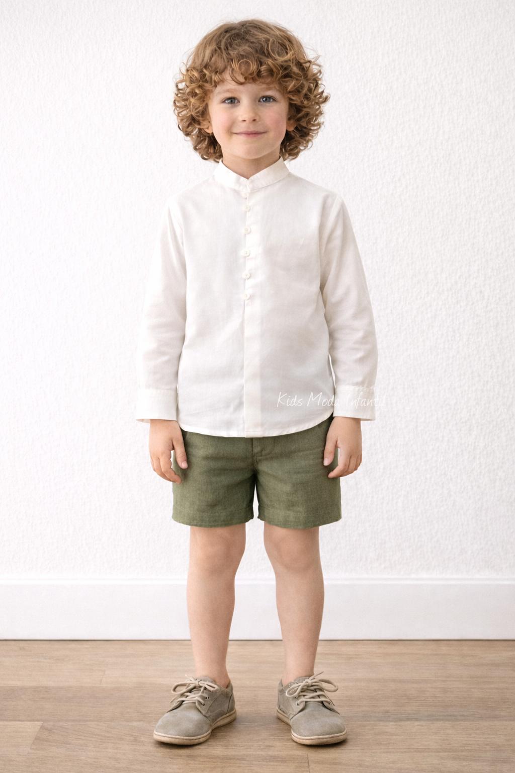 Precioso conjunto niño vestir arras y ceremonias especiales confeccionado en dos prendas, camisa lino blanco roto, con botonadura vista cuerpo con ojales vistos y cuello Mao; combinando precioso pantalón chino bermuda en tejido lino verde oliva con botón y cremallera, perfecto e ideal para combinar con los preciosos vestidos de niña arras Eva Martínez Artesanía 40412cbg