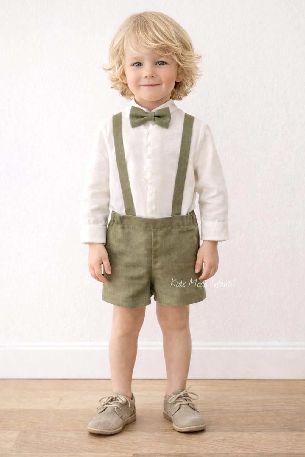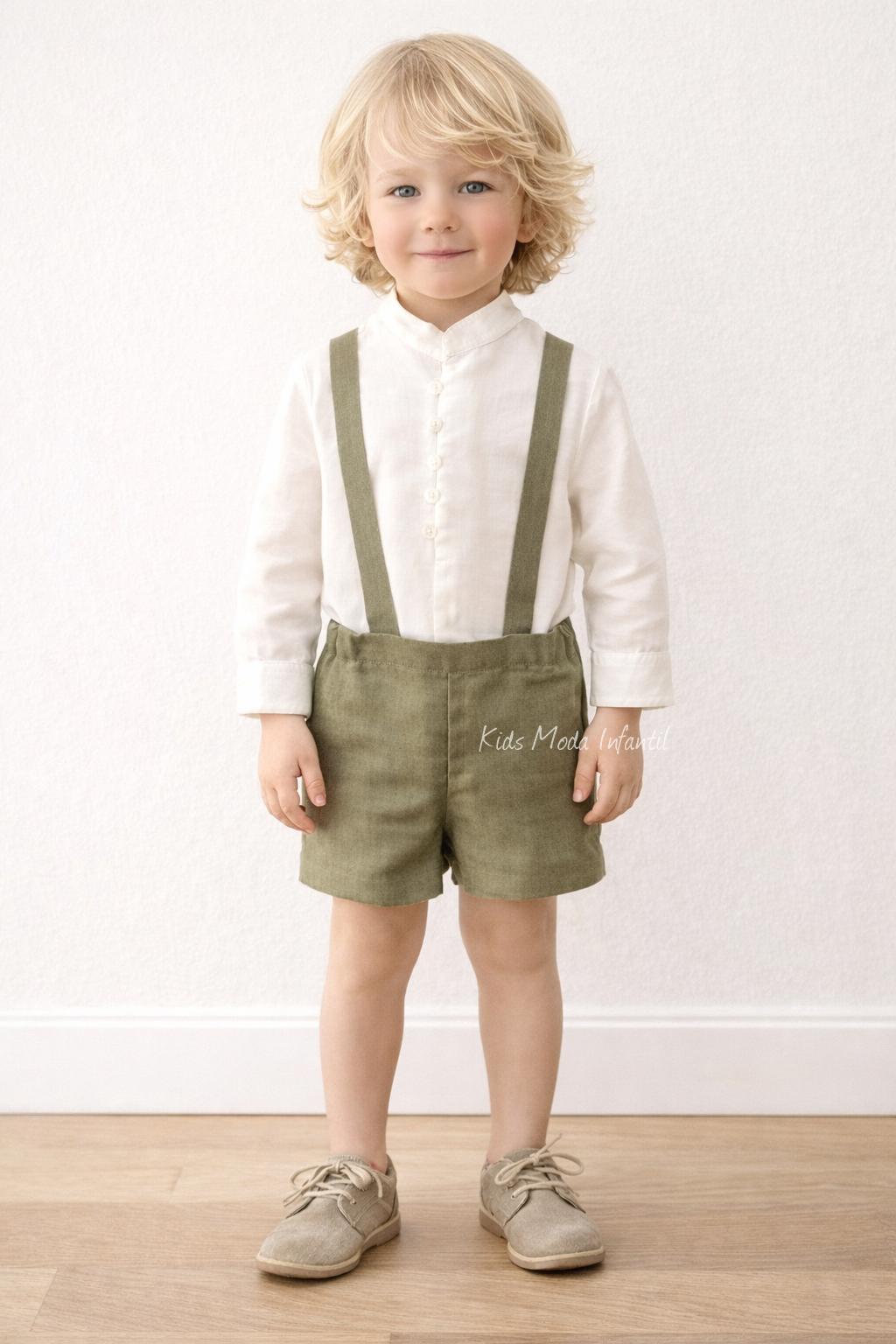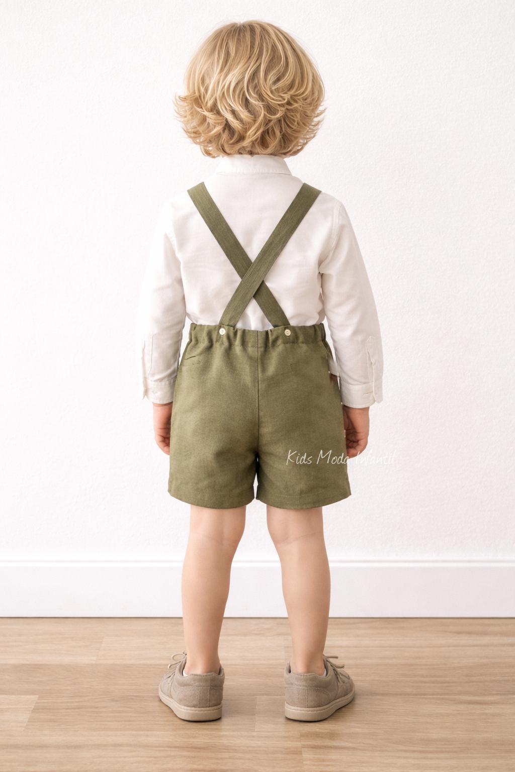 Conjunto ceremonia niño camisa y peto con tirantes verde oliva de Eva Martinez Artesanía
