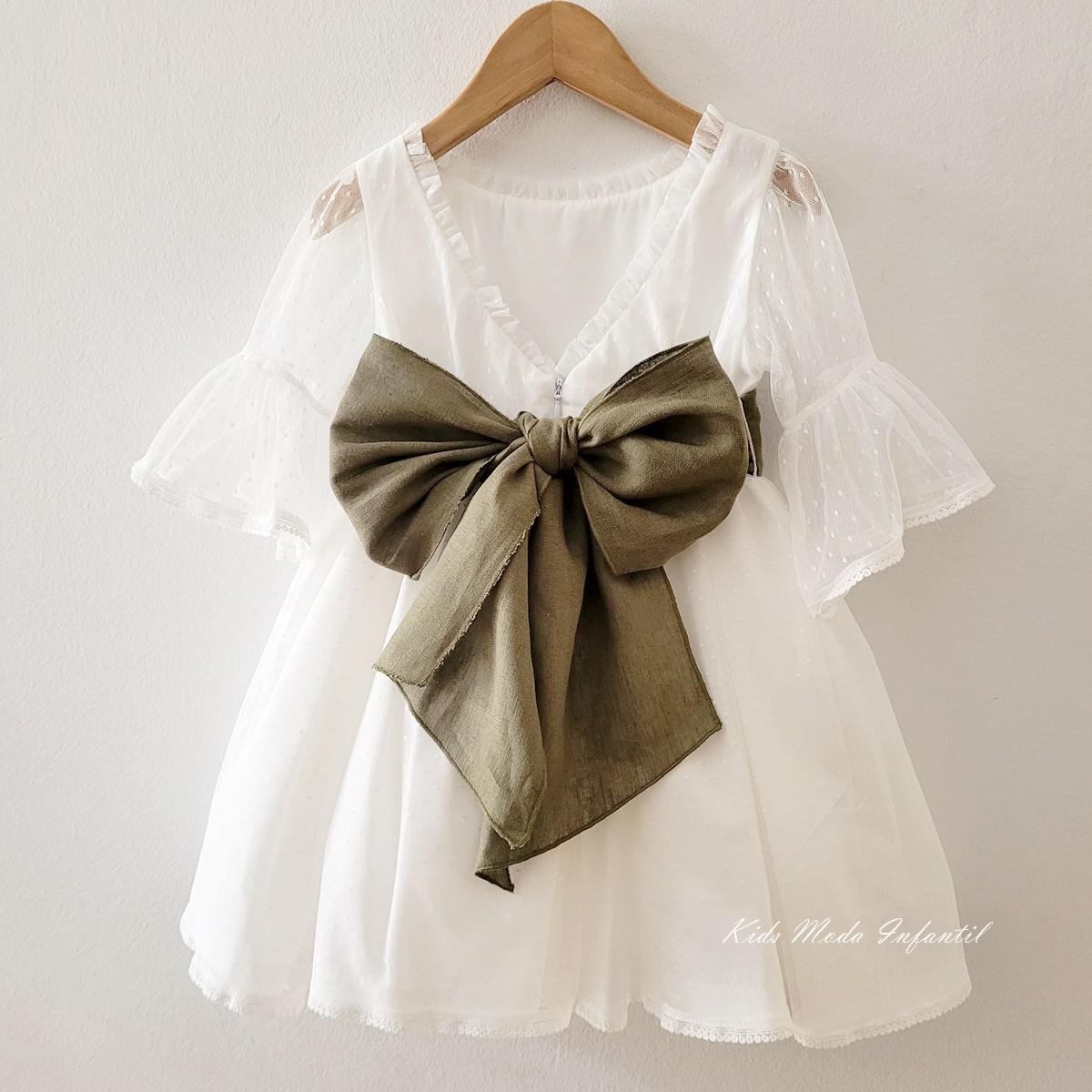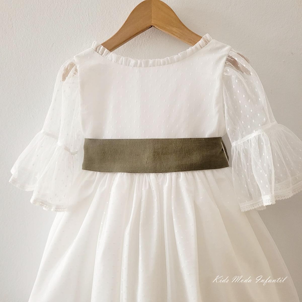 Precioso vestido ceremonia para niñas y arras confeccionado en un precioso tul blanco roto en la parte del cuerpo, mangas y su falda de vuelo confeccionado en el mismo tejido. Te fascinará su fajín con preciosa lazada para hacer en tejido lino verde oliva y el precioso escote, además luce preciosa media manga con preciosa puntilla calada y bordada al tono.