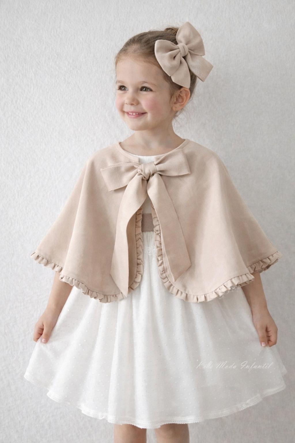 Precioso vestido arras para niñas y ceremonias especiales confeccionado en un precioso tul blanco roto en la parte del cuerpo, mangas y su falda de vuelo confeccionado en el mismo tejido. Te fascinará su fajín con preciosa lazada para hacer en tejido lino camel y el precioso escote, además luce preciosa media manga con preciosa puntilla calada y bordada al tono.