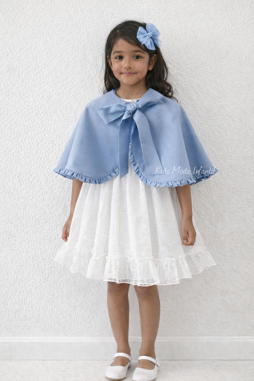 VESTIDO CEREMONIA NIÑA MANGA LARGA BLANCO ROTO Y AZUL.