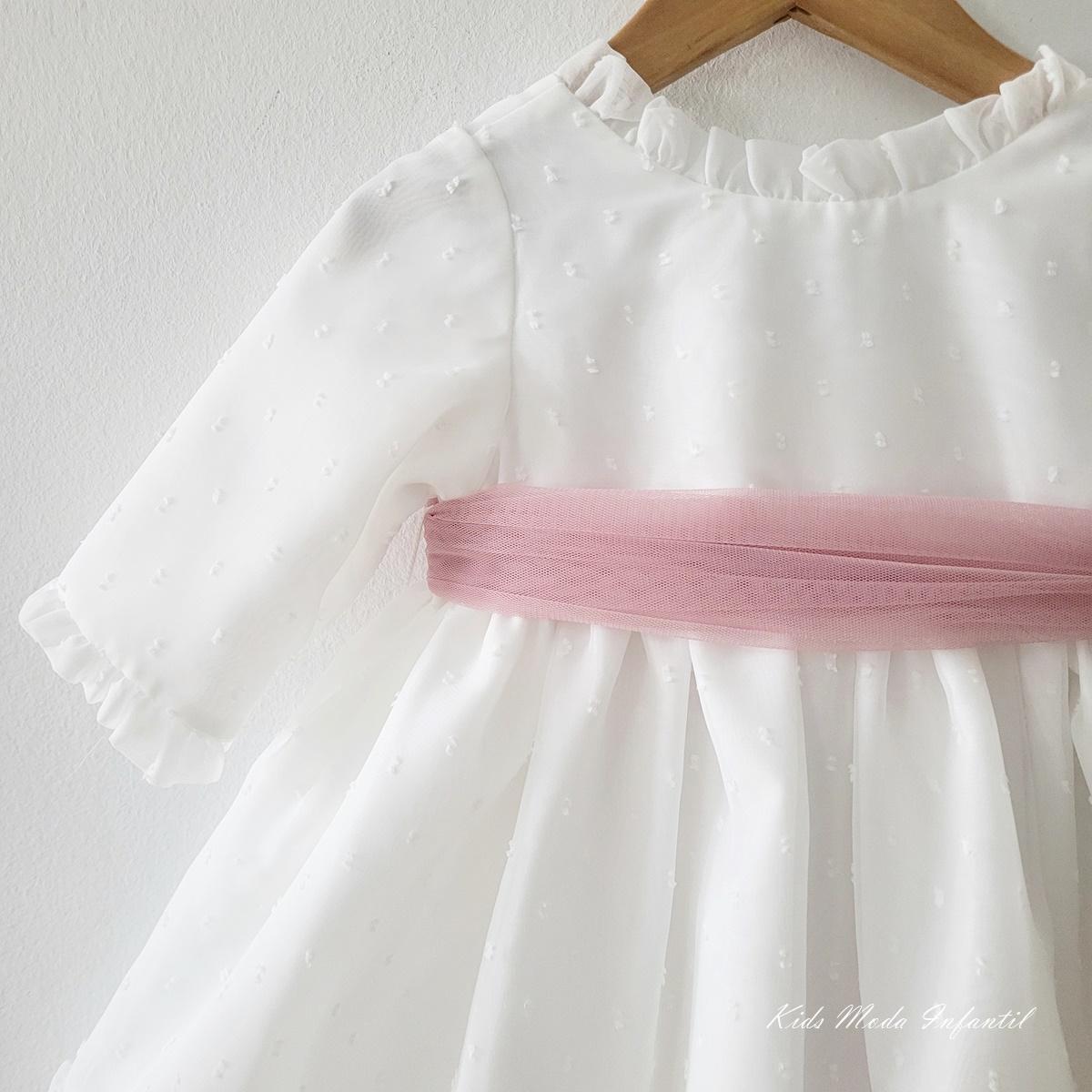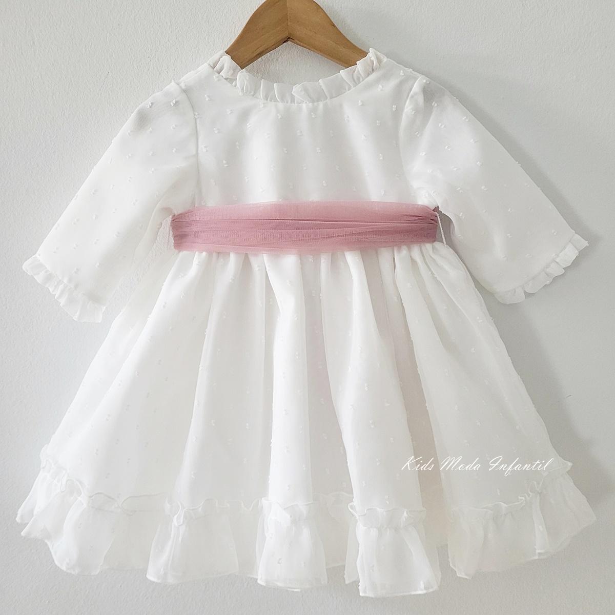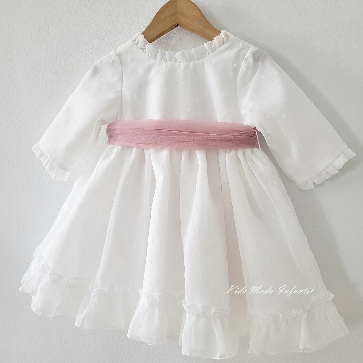 Ideal y perfecto vestido niña ceremonia manga larga confeccionado en tejido plumeti cristal blanco roto combinando precioso fajín con lazada en espalda de tul rosa empolvado. Te encantara el precioso escote a pico que luce en espalda. 3 meses a 48 meses en largo cbg (con braguita), de 5 a 16 años largo normal (sin braguita).
