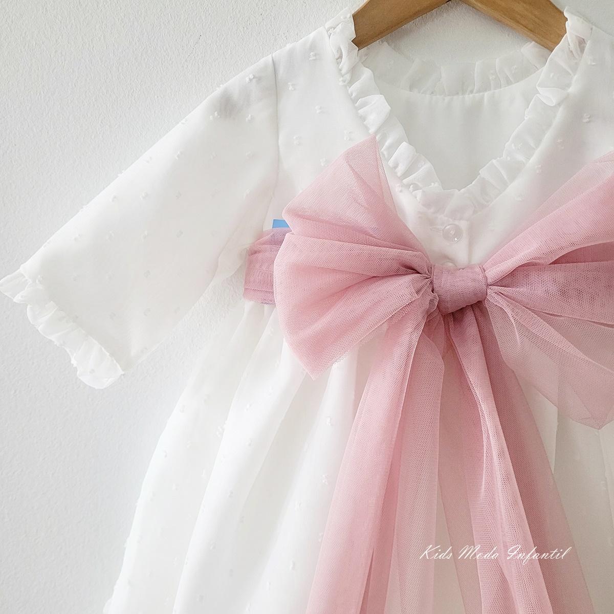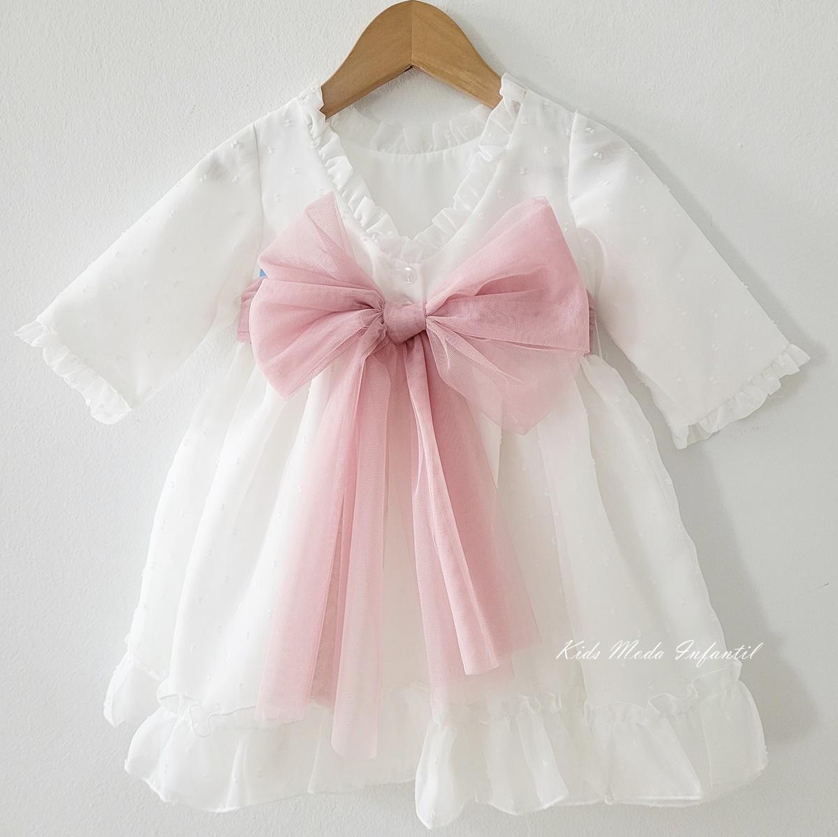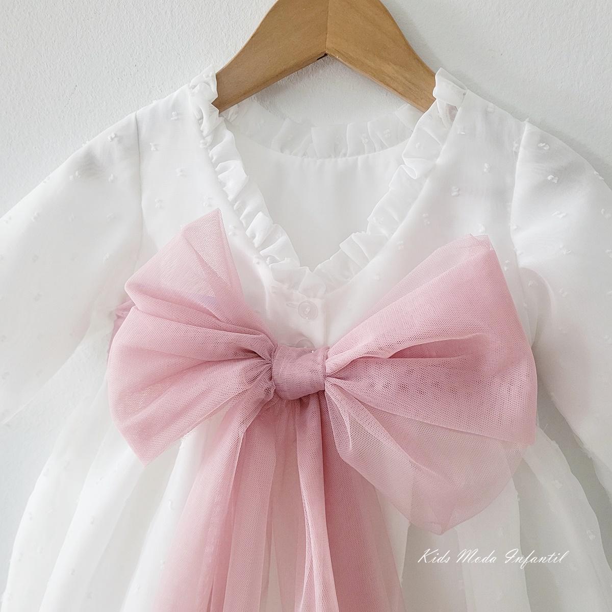 Ideal y perfecto vestido niña ceremonia manga larga confeccionado en tejido plumeti cristal blanco roto combinando precioso fajín con lazada en espalda de tul rosa empolvado. Te encantara el precioso escote a pico que luce en espalda. 3 meses a 48 meses en largo cbg (con braguita), de 5 a 16 años largo normal (sin braguita).
