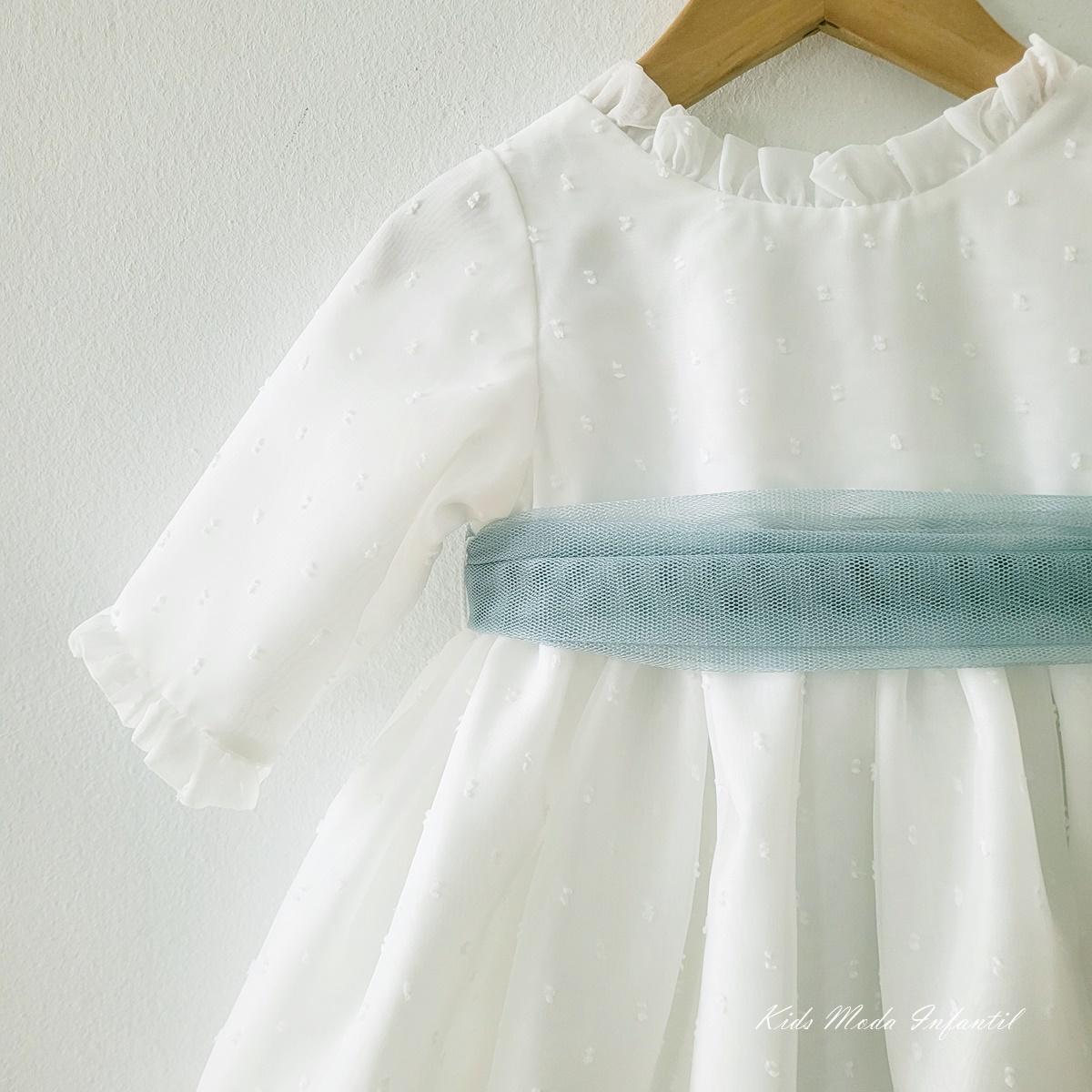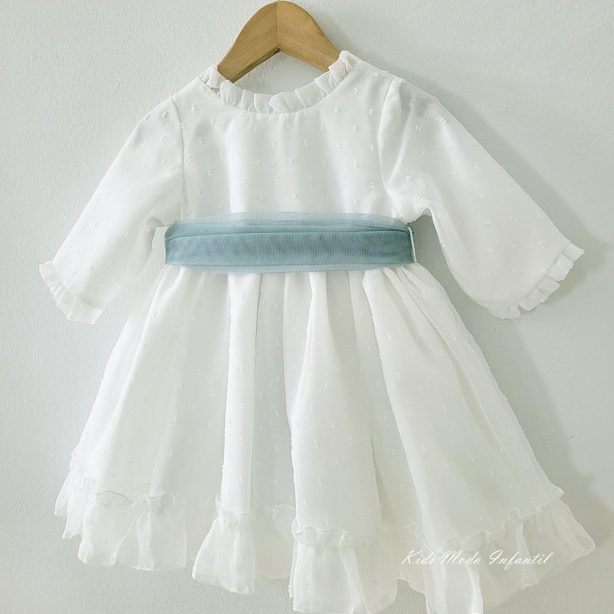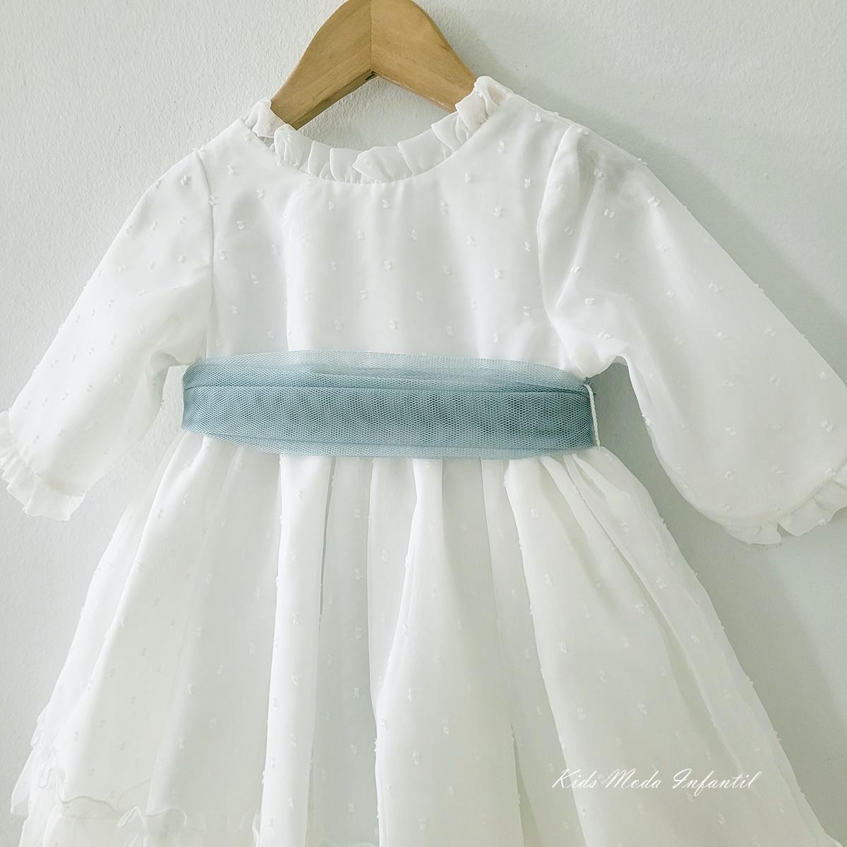 Ideal y perfecto vestido niña arras manga larga confeccionado en tejido plumeti cristal blanco roto combinando precioso fajín con lazada en espalda de tul verde empolvado. Te encantara el precioso escote a pico que luce en espalda. 3 meses a 48 meses en largo cbg (con braguita), de 5 a 16 años largo normal (sin braguita).