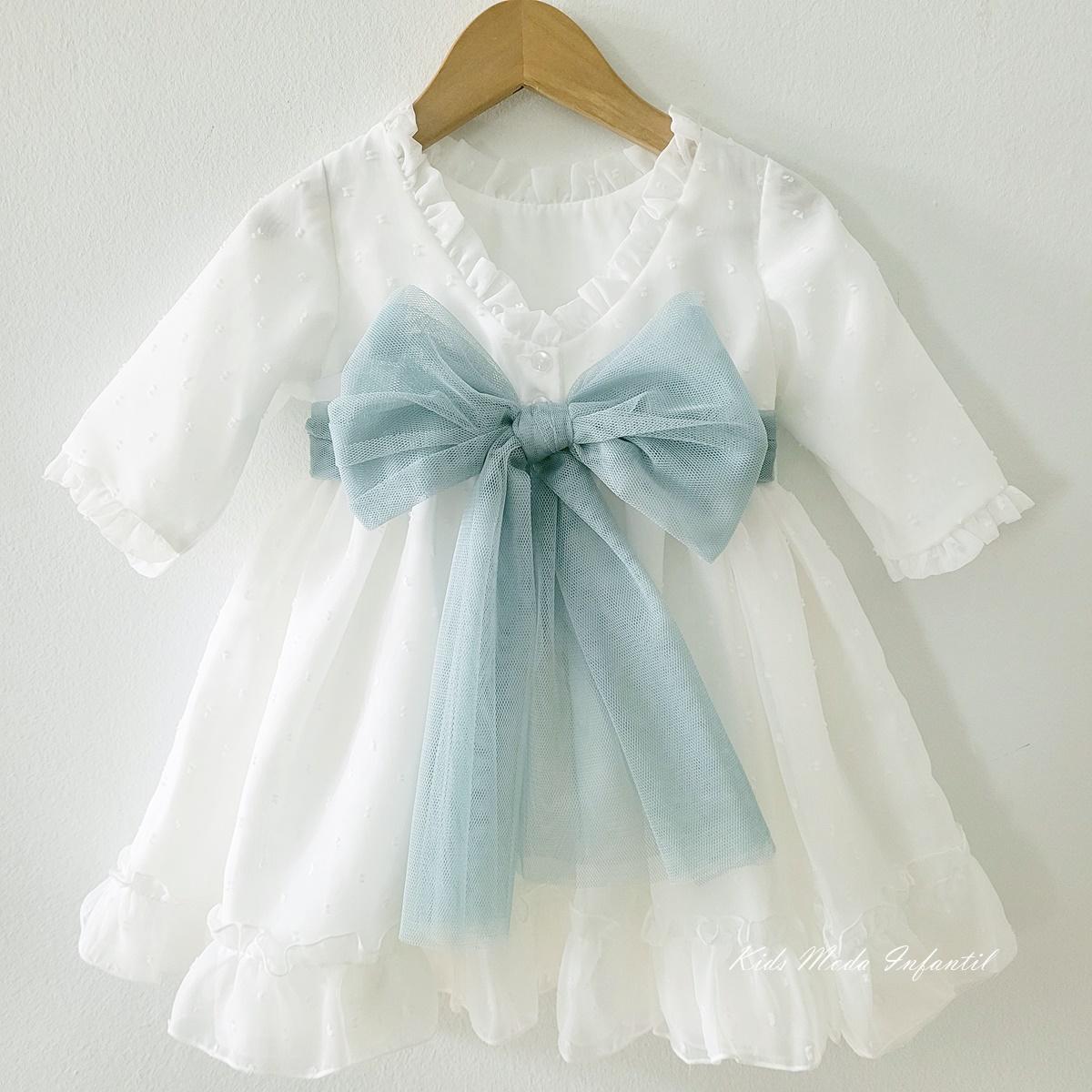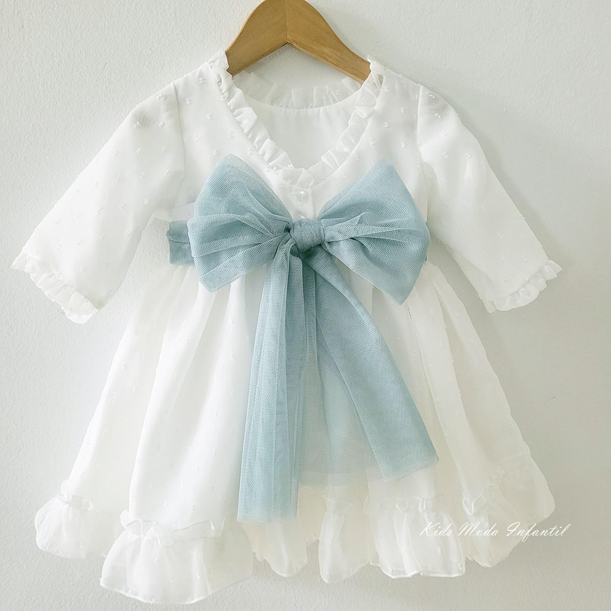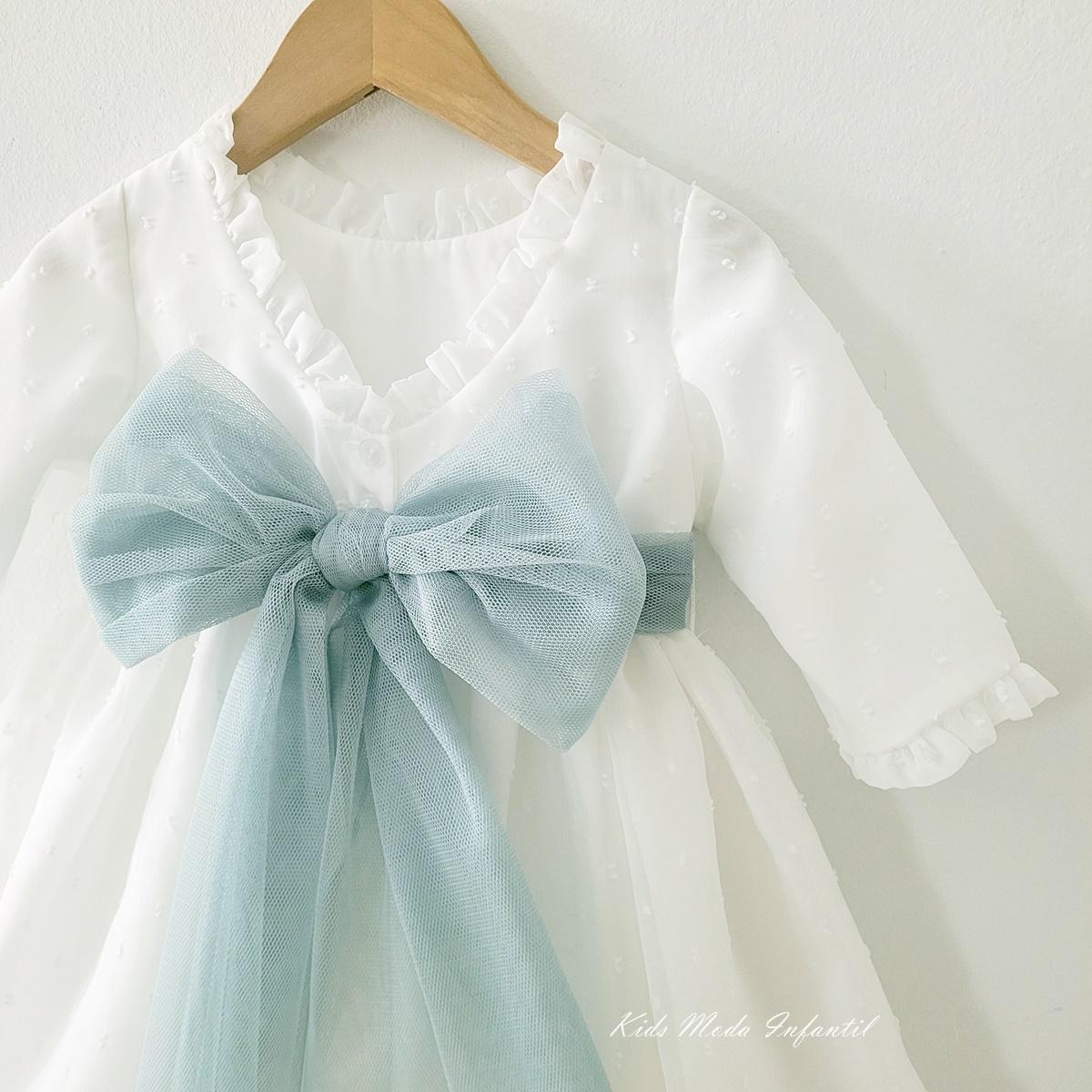 Ideal y perfecto vestido niña arras manga larga confeccionado en tejido plumeti cristal blanco roto combinando precioso fajín con lazada en espalda de tul verde empolvado. Te encantara el precioso escote a pico que luce en espalda. 3 meses a 48 meses en largo cbg (con braguita), de 5 a 16 años largo normal (sin braguita).