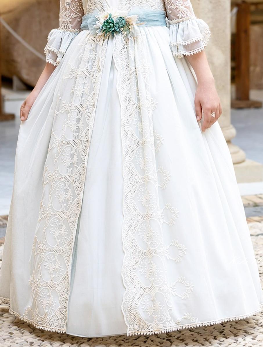 Vestido de comunión en tul bordado con motivos florales, base de organza ligera y color marfil con fajín verde empolvado. Diseño clásico-romántico, con cuerpo de escote redondo, mangas francesas rematadas en puntilla y falda amplia de varias capas con bordados en hilo marfil. El fajín de tul se anuda en la espalda con lazo y detalle floral en tonos verde agua y crema. Cierre oculto con abertura en lágrima y acabados artesanales de gran delicadeza. Ideal para ceremonias de Primera Comunión.