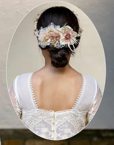 Uno de los elementos más especiales del modelo es su fajín de tul en tono rosa salmón, que se ajusta con elegancia a la cintura y se adorna con un delicado conjunto de flores en tonos empolvados. Este detalle aporta color, dulzura y un aire primaveral al conjunto.