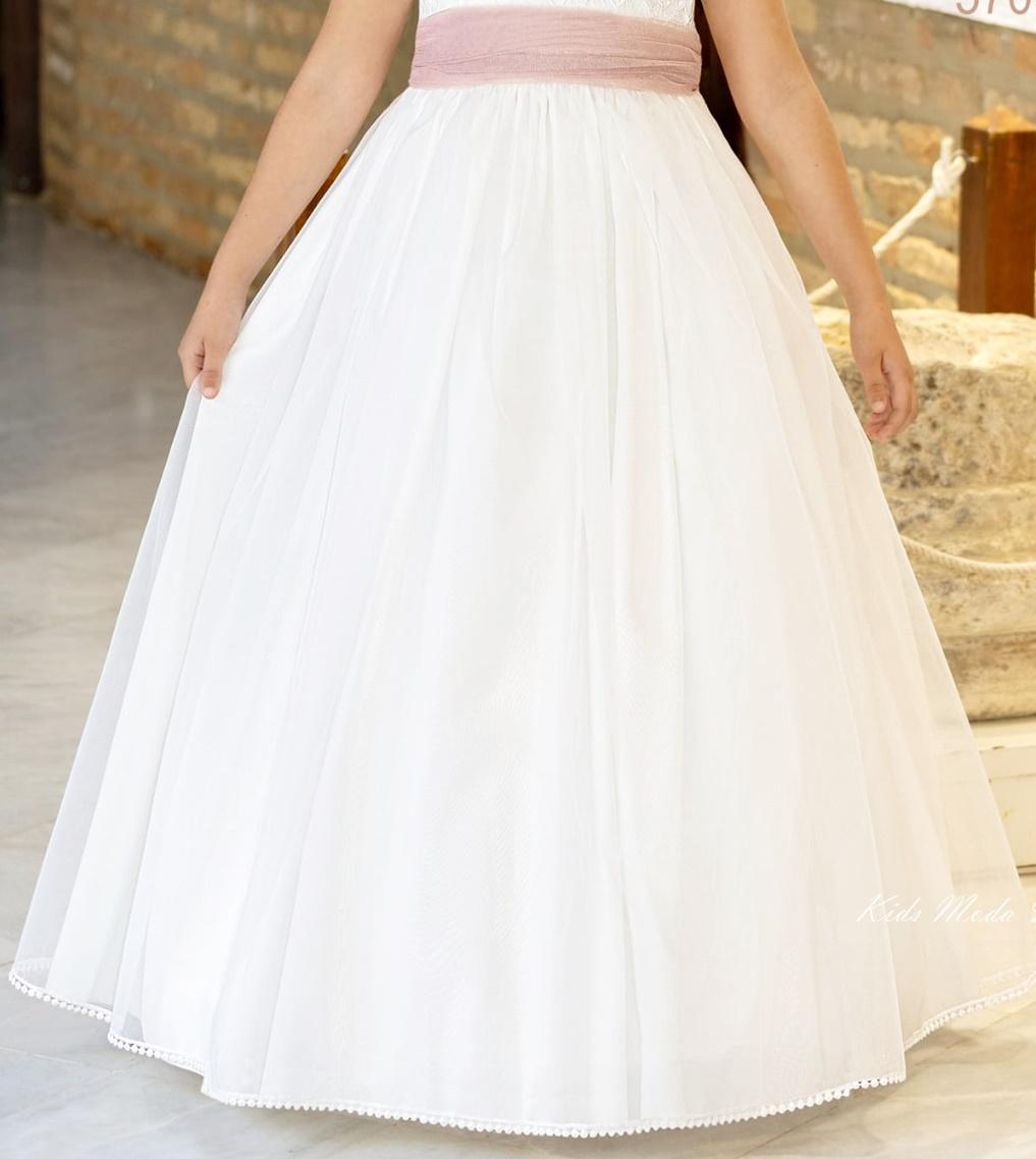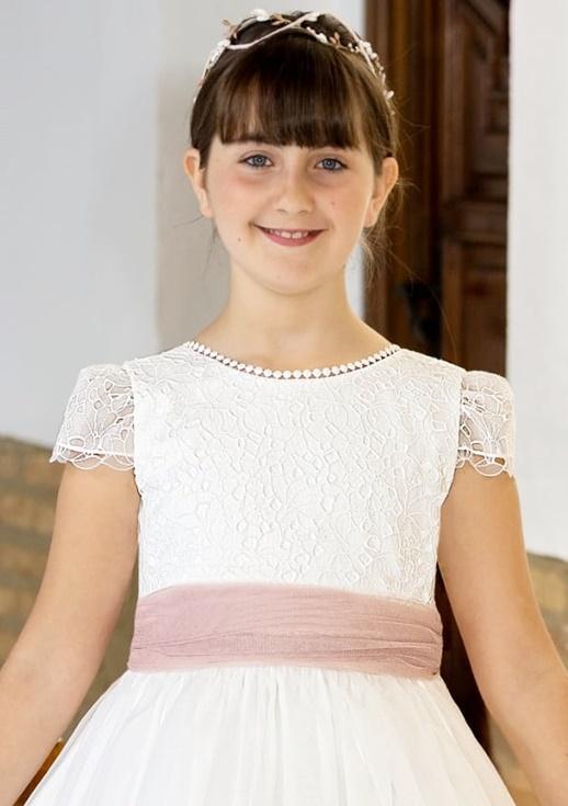 Vestido de Comunión Miguel Serrano 2026 – Tul Bordado y organza y Fajín Rosa Nude