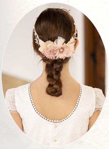 El peinado que acompaña a este diseño, tal como se muestra en la imagen, consiste en una trenza baja decorada con flores en tonos empolvados y nude, a juego con el fajín, aportando un aire fresco y natural que complementa perfectamente la estética del vestido.
