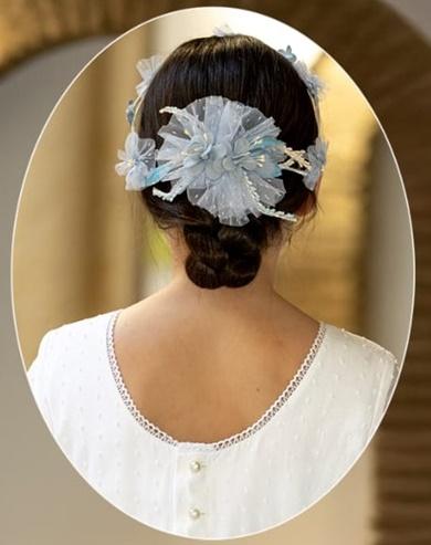 El protagonista del contraste es el fajín de tul en tono celeste pastel, que marca la cintura con suavidad. Este fajín, fruncido y anudado en la espalda, añade un delicado toque de color al conjunto, sin romper la armonía cromática del blanco predominante. Además, puede combinarse con complementos florales o coronas del mismo tono, como sugiere el estilismo de la imagen, donde la niña lleva un recogido decorado con flores celestes a juego.