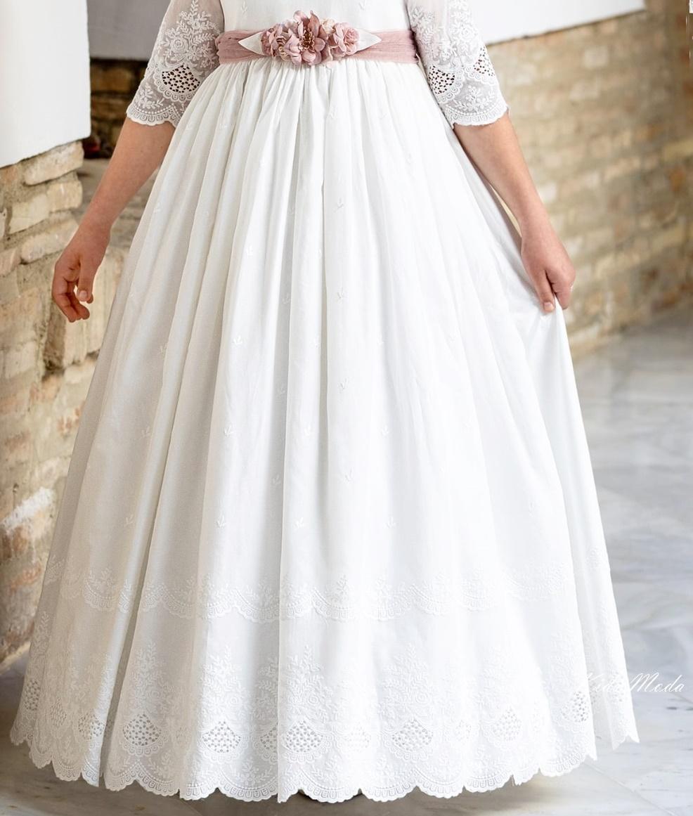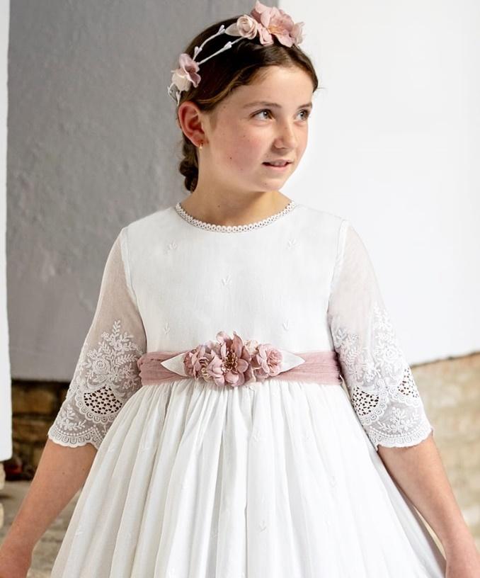 Vestido de Comunión 2026 Miguel Serrano en Batista Bordada Blanca con Fajín de Tul Rosa Nude