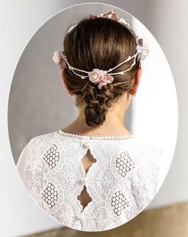 Ideal para complementar con una corona o tocado floral en tonos rosa y marfil, zapatos de comunión clásicos y una rebeca ligera para ceremonias en primavera.