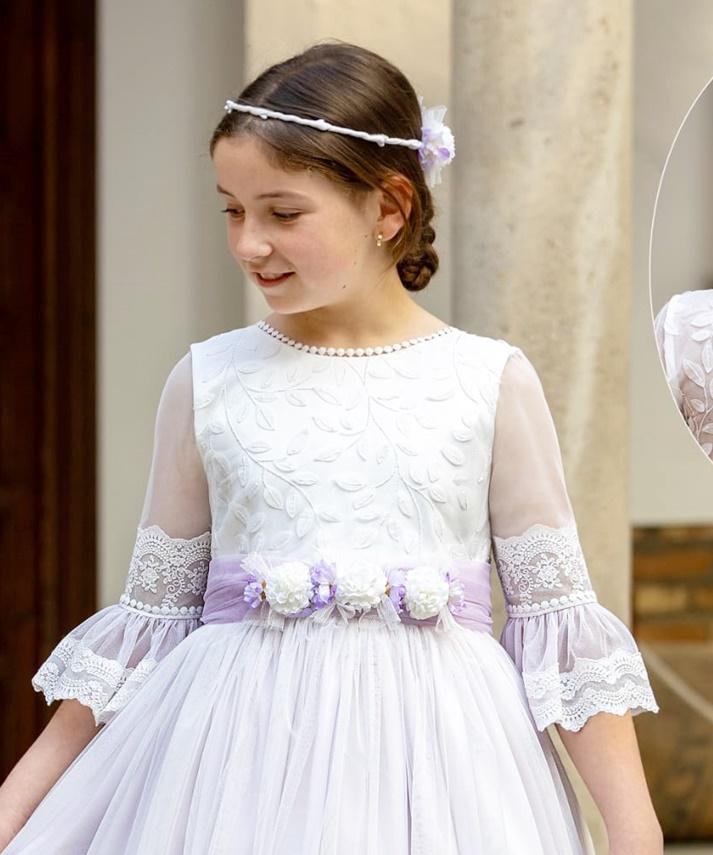 La falda, amplia y vaporosa, está realizada en varias capas de tul blanco, creando un efecto etéreo y delicado. El fajín de tul en tono lila resalta la cintura con dulzura y armonía, adornado con flores artesanales en tonos blanco y lavanda que aportan un aire romántico y primaveral.