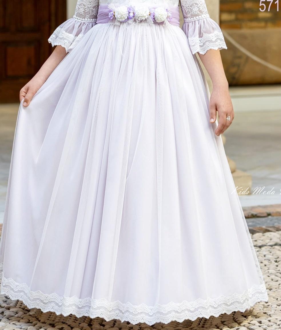 Vestido de Comunión 2026 Miguel Serrano modelo 5715Encantador vestido de comunión en tul bordado blanco con delicadas mangas francesas y volante de encaje, ideal para un look romántico y elegante. Destaca su fajín de tul lila con flores artesanales, que aporta un toque de color y dulzura. Un diseño exclusivo de Miguel Serrano lleno de encanto y estilo.
