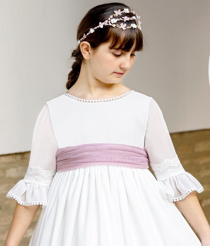 Elegante y delicado vestido primera comunión confeccionado en bambula blanca, con una caída suave y natural. Destaca su fajín de tul en tono malva, que aporta un toque romántico y de color al conjunto.