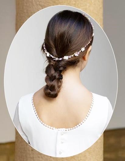 Como complemento ideal, la niña luce una corona de flores y perlas en tonos a juego con el fajín, que realza la dulzura del peinado y completa un look de comunión de ensueño.
