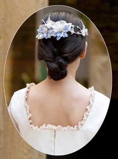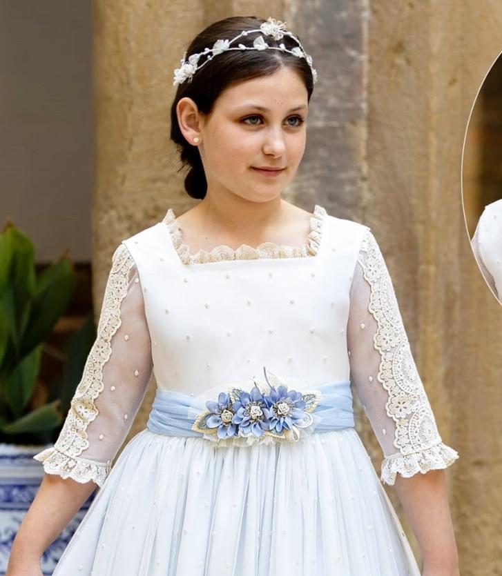 En la parte posterior, el vestido se cierra con una discreta cremallera y presenta una elegante caída de la falda, completando un diseño armonioso y equilibrado. El conjunto se complementa con una corona floral coordinada, con detalles en azul y marfil, ideal para el peinado recogido o trenzado de comunión.