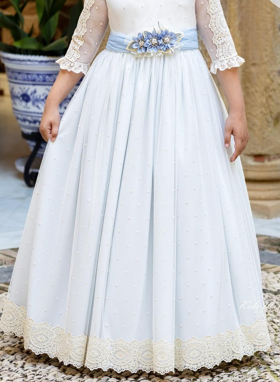 Vestido de Comunión 2026 Miguel Serrano confeccionado en tul bordado con delicados topitos y encaje en el bajo. Cuerpo con escote cuadrado y mangas francesas de tul con puntilla. Destaca su fajín de tul celeste con aplicación floral artesanal, que aporta un toque romántico y elegante. Diseño exclusivo, ideal para una primera comunión clásica y sofisticada.