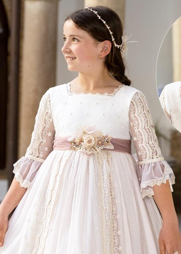 Vestido de Comunión 2026 Miguel Serrano, confeccionado en tul bordado color marfil con encaje y topitos. Cuerpo con escote cuadrado y mangas francesas con puntilla. Destaca su fajín de tul rosa nude con flores artesanales que aportan un toque romántico y elegante. Ideal para una primera comunión clásica, delicada y con estilo vintage.