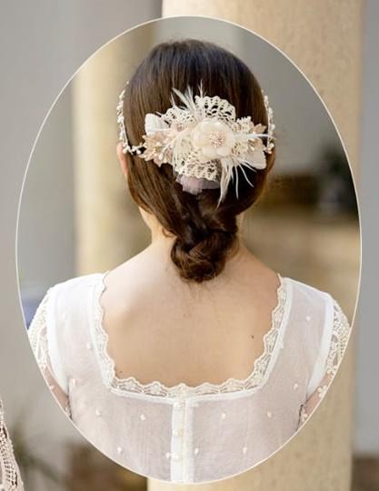 El look se completa con una diadema floral a juego, en tonos nude y marfil, que combina a la perfección con el estilo romántico del vestido.
