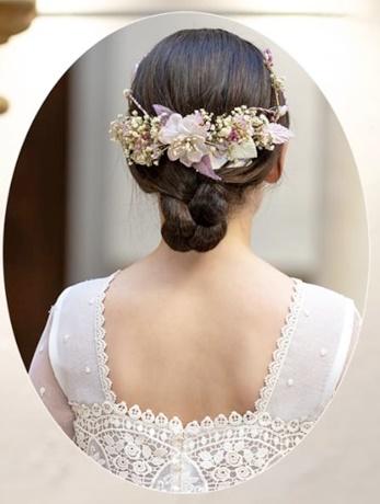 El conjunto se completa con una corona o tocado floral a juego, en los mismos tonos malvas y marfiles, que aporta el toque final de dulzura y armonía al look.