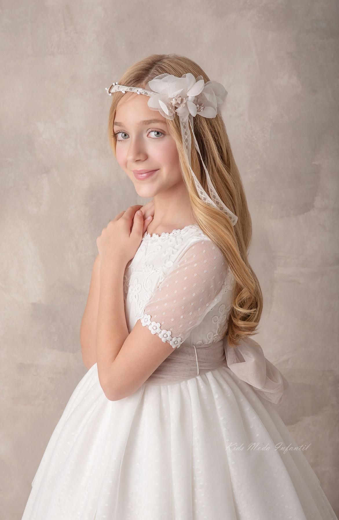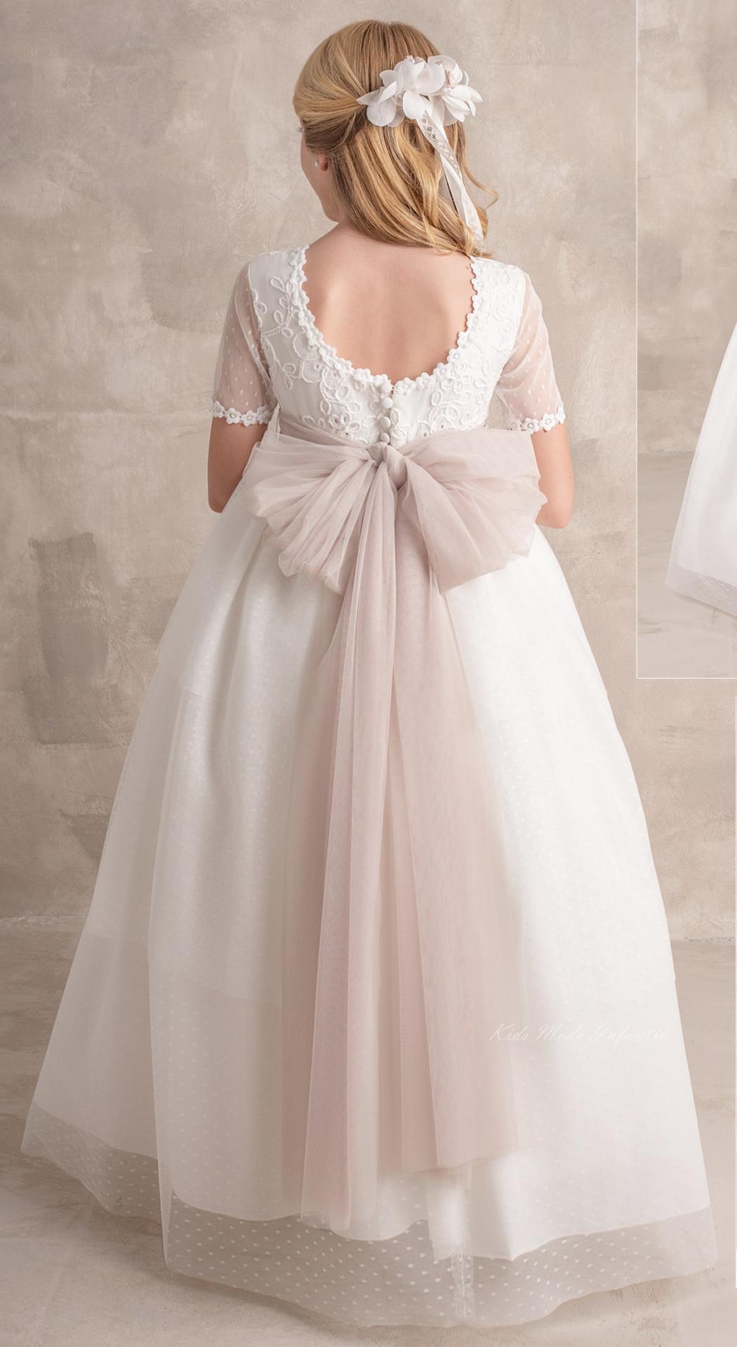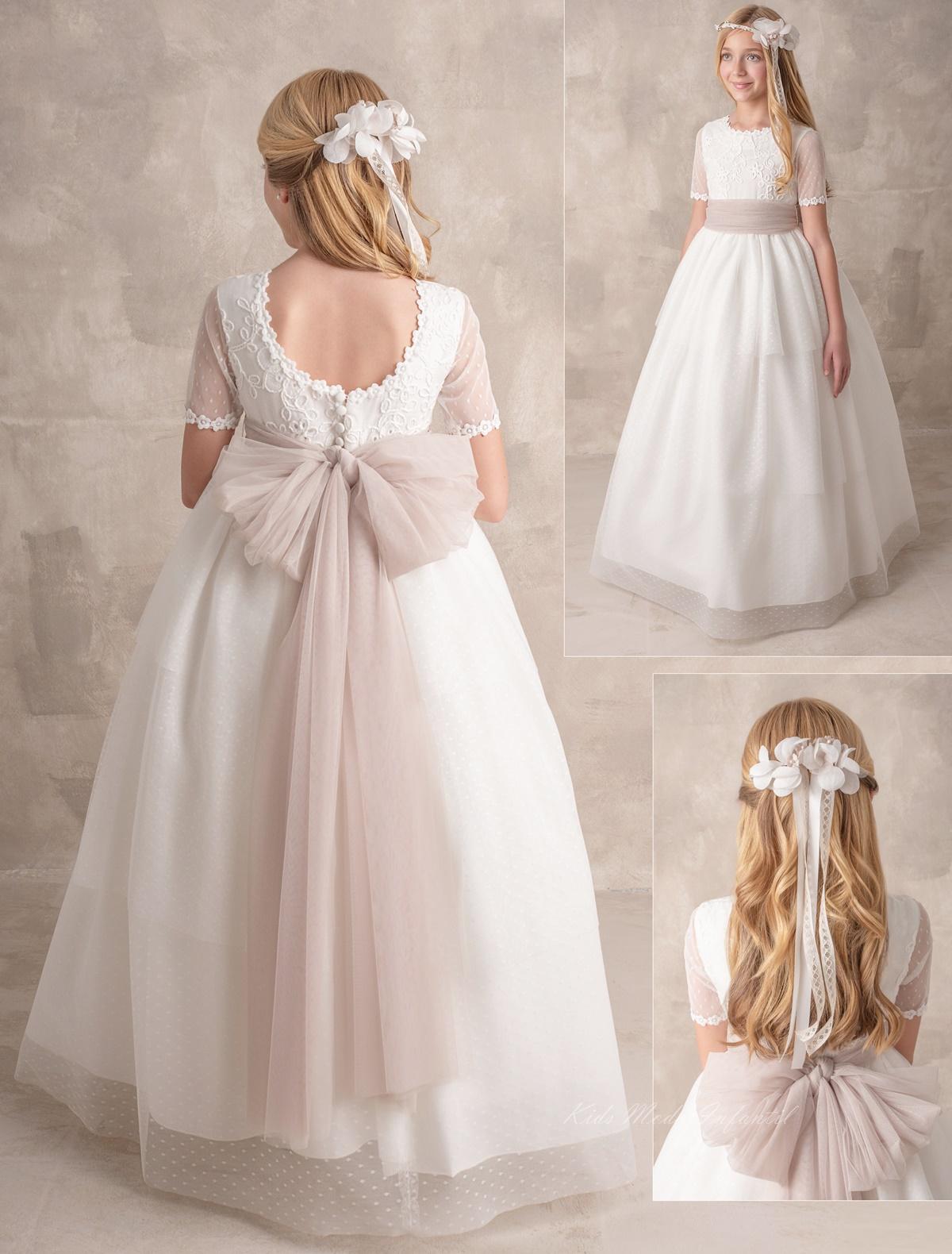 Vestido de Comunión Niña Nekenia 2621813 tul blanco roto con fajín camel y lazo trasero – Kids Moda Infantil
