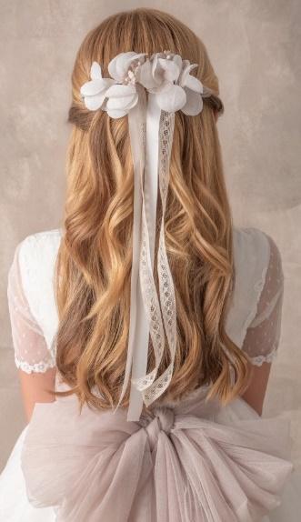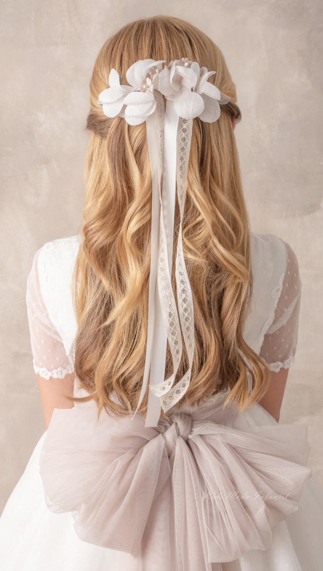 La cinta de pelo floral de comunión, perfecta para peinados naturales o semirrecogidos.