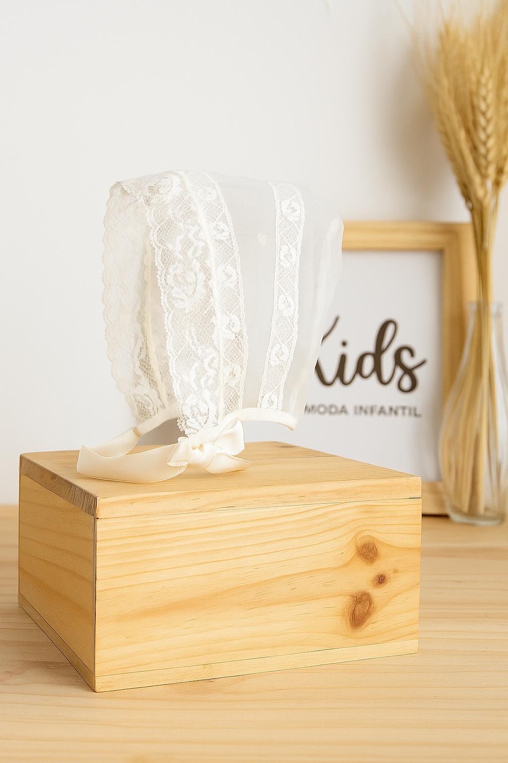 Su diseño incluye franjas de encaje bordado sobre una base de gasa muy delicada, creando un efecto visual suave, romántico y perfecto para las ceremonias más especiales. Los lazos de raso laterales permiten ajustar la capota de forma cómoda y segura, aportando un toque clásico que realza el rostro del bebé.