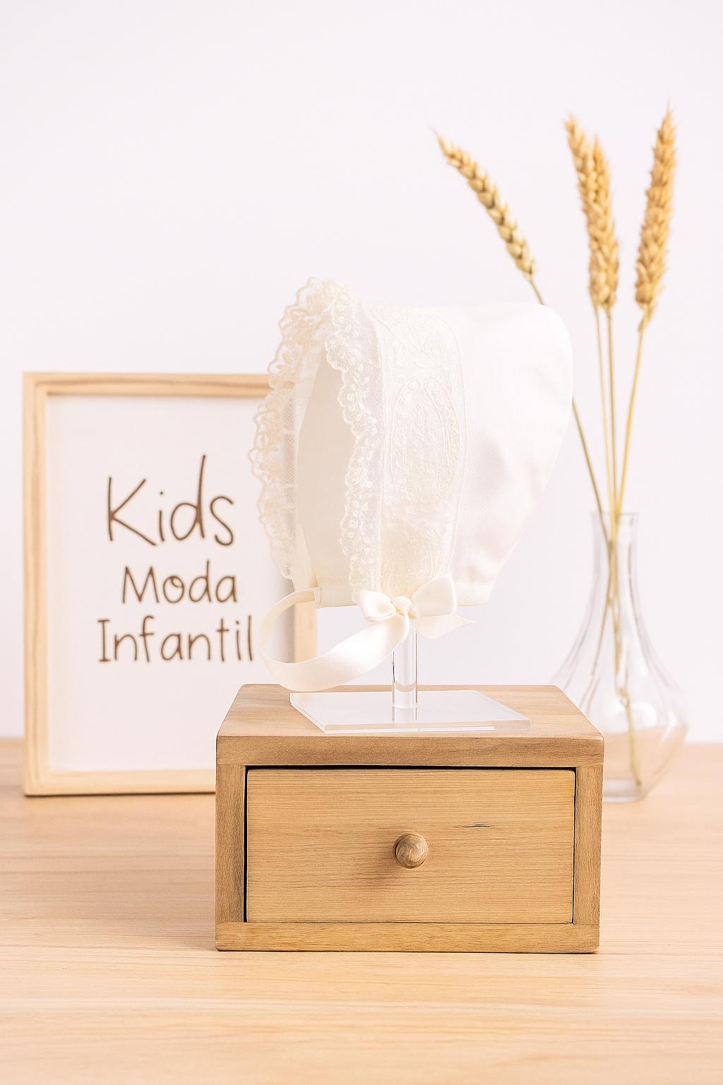 La Capota Tul Cristal, confeccionada en España, combina tul delicado, encaje bordado y lazos de raso. El complemento perfecto para faldones, batones, peleles y vestidos de bautizo, aportando un estilo dulce, clásico y elegante en ceremonias especiales.