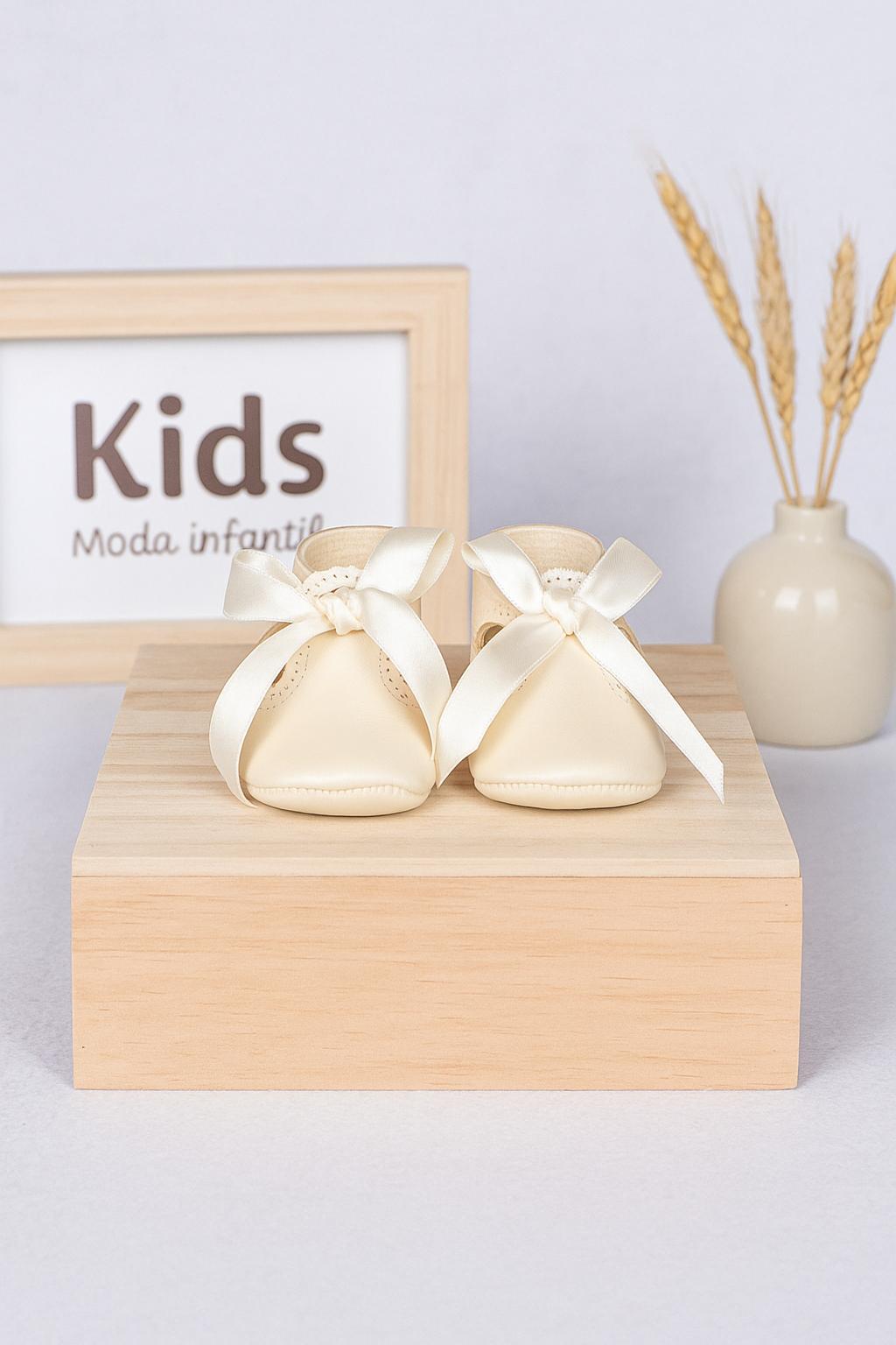 Zapatitos de bautizo en piel ovina beige con diseño clásico y lazada de raso, ideales para combinar con faldones, batones, peleles y conjuntos de ceremonia. Elegantes, suaves y perfectos para un look tradicional.