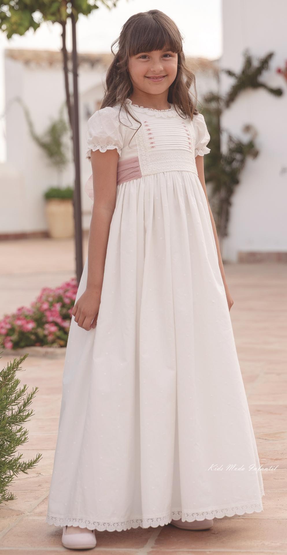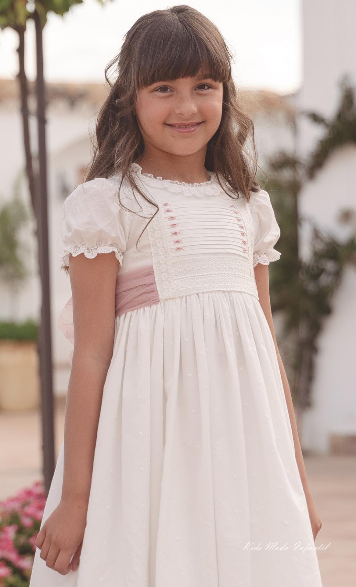 El vestido de Comunión “Lara” 2026 de Eva Martínez Artesanía destaca por su algodón bordado blanco roto, jaretas hechas a mano, entredos de tul y flores minuto bordadas en rosa empolvado. Una pieza artesanal, romántica y exclusiva, disponible en Kids Moda Infantil.