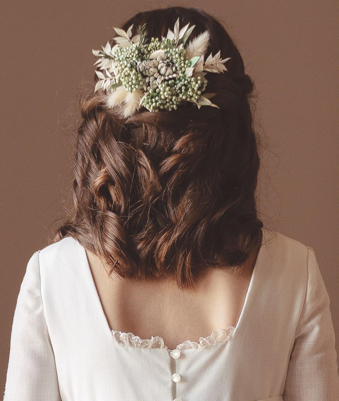Su diseño redondeado y cuidadosamente elaborado se integra de manera ideal con peinados semirrecogidos o trenzados, ofreciendo una presencia elegante sin resultar excesiva. Cada flor y cada hoja han sido seleccionadas minuciosamente, manteniendo la filosofía de artesanía y delicadeza propia de Eva Martínez Artesanía. Gracias al uso de flores preservadas, el tocado mantiene su belleza durante años, convirtiéndose en un recuerdo inolvidable de un día tan especial.