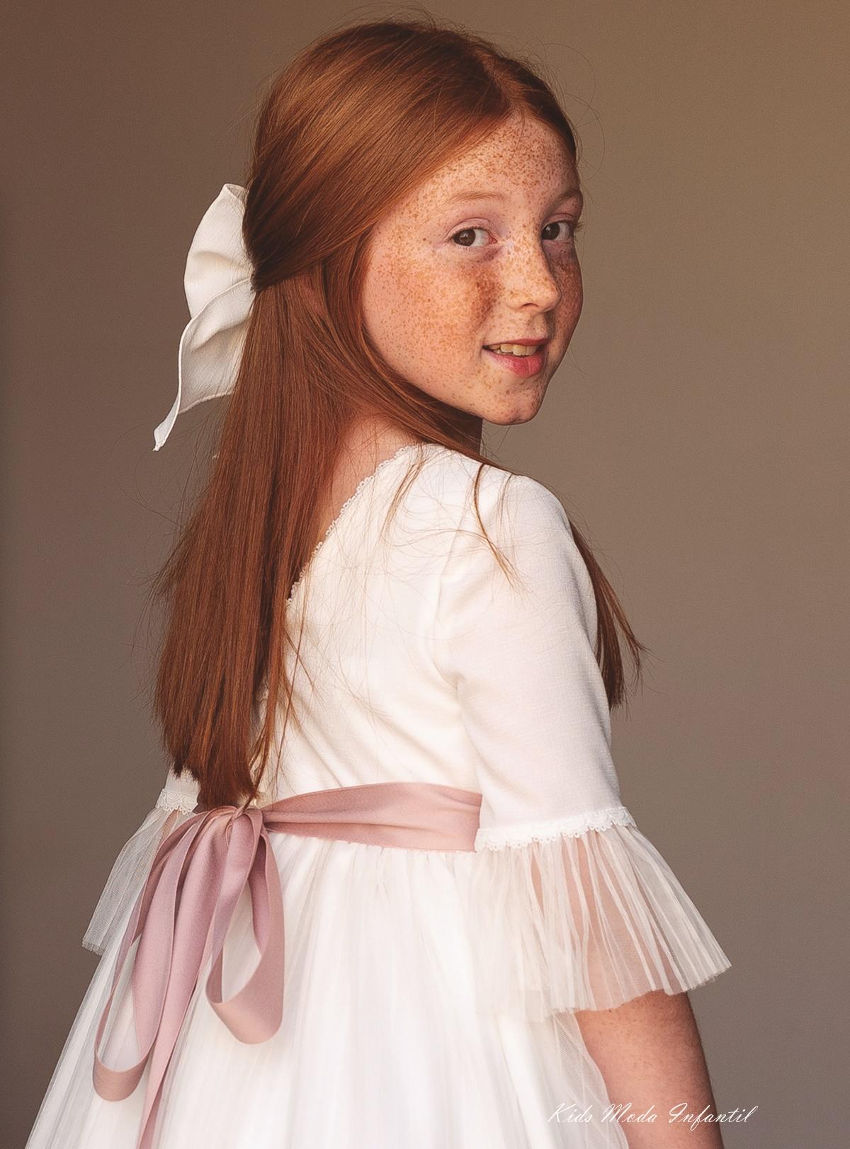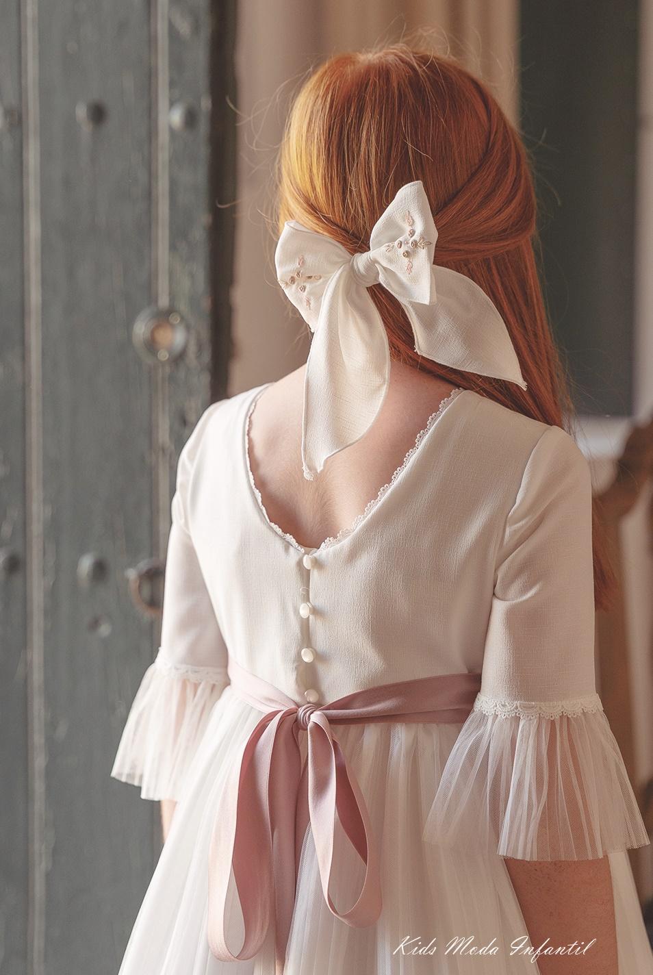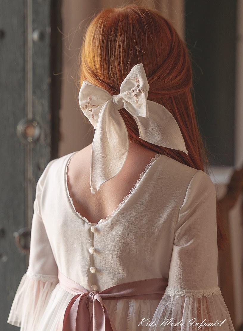 Lazo artesanal en crep blanco roto con bordado al tono, perfecto para peinados de comunión. Complemento exclusivo de la Colección LYSANDRA 2026. Disponible en Kids Moda Infantil.