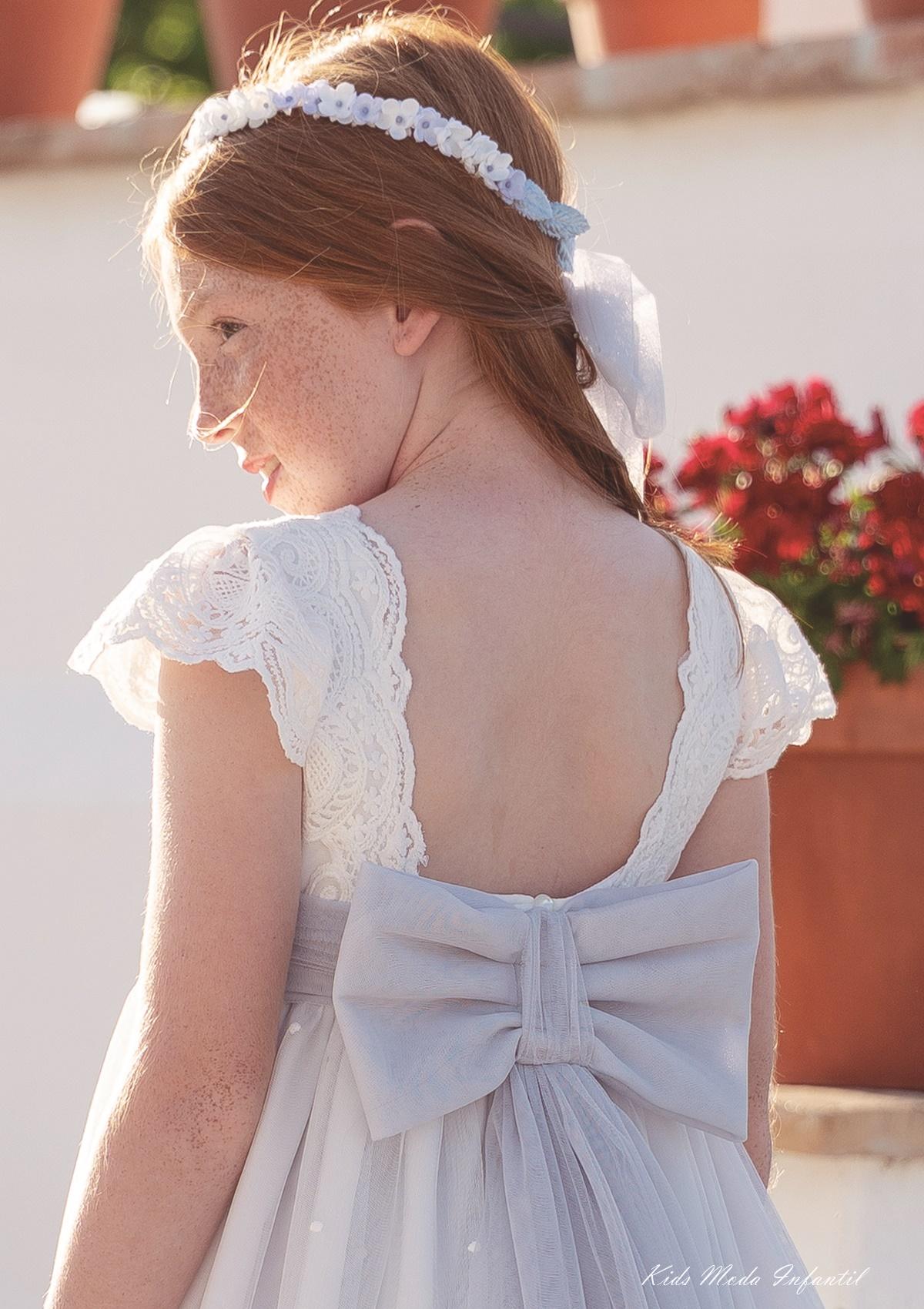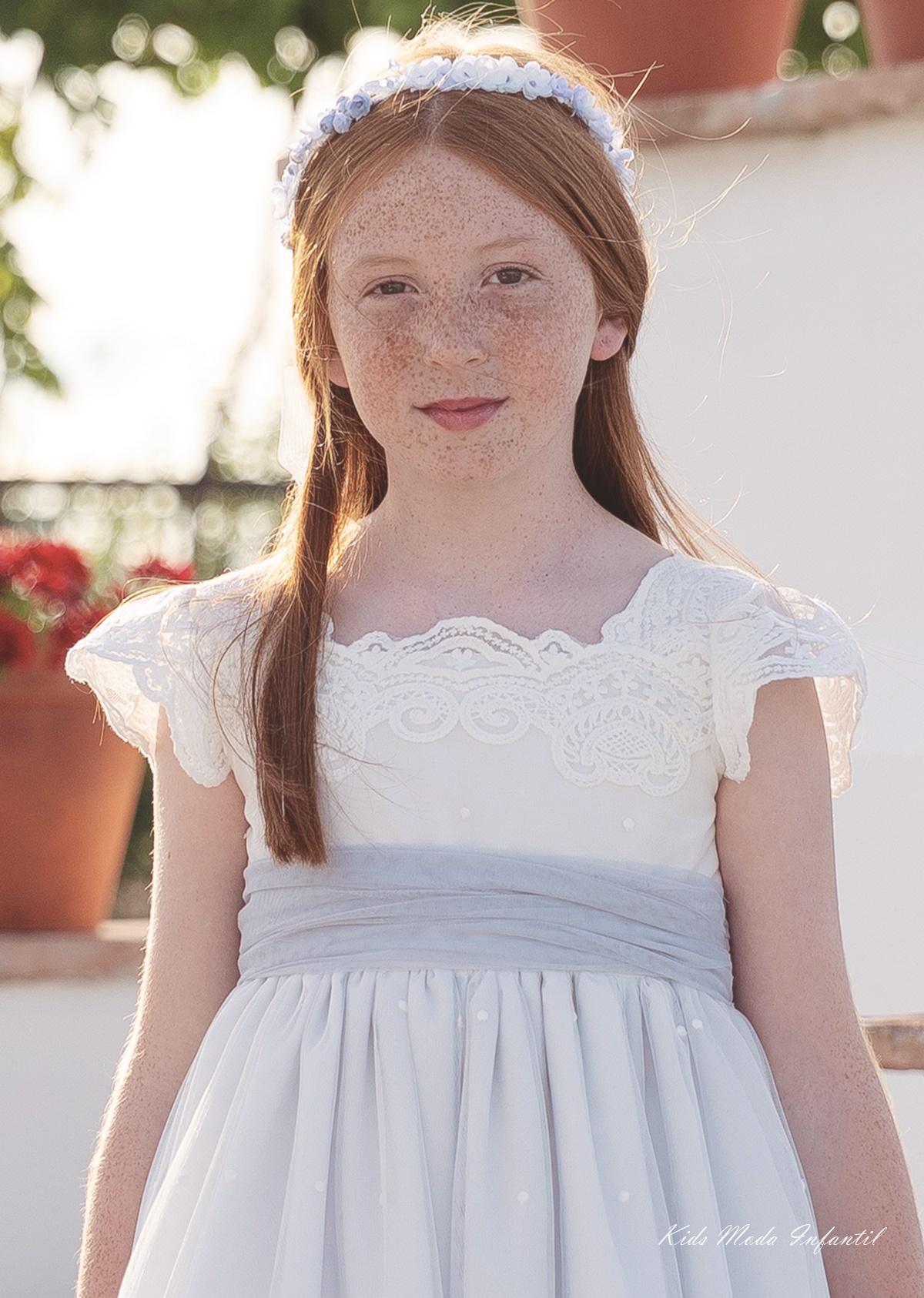 Vestido de Comunión LILY 2026 – Tul Bordado Blanco Roto y Azul Gris | Eva Martínez Artesanía