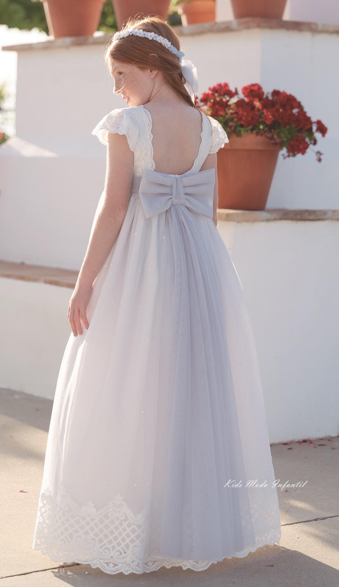 Vestido artesanal en tul bordado blanco roto con fajín y falda en tul azul gris. Diseño exclusivo con encaje, lazada trasera y detalles cuidados al máximo. Disponible en Kids Moda Infantil.