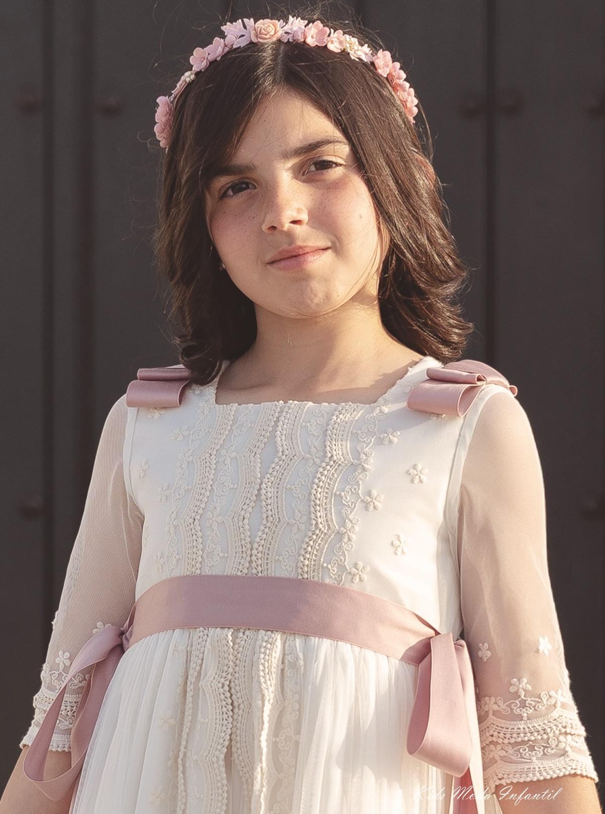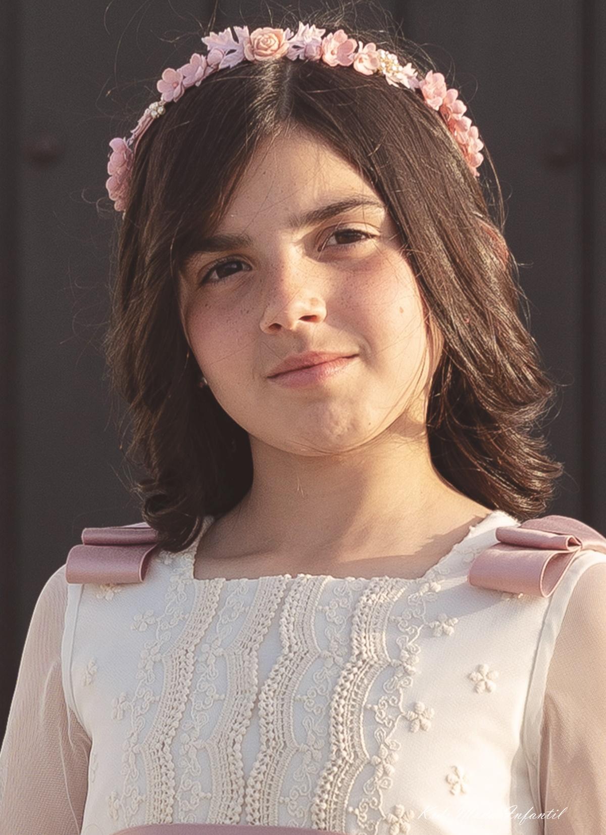 La tiara de Comunión Lina destaca por sus flores artesanales en tonos rosa maquillaje, detalles bordados y un bonito lazo de tul en la parte trasera. Un complemento elegante y romántico, perfecto para combinar con vestidos en tonos suaves y completar un look de Comunión dulce y especial.