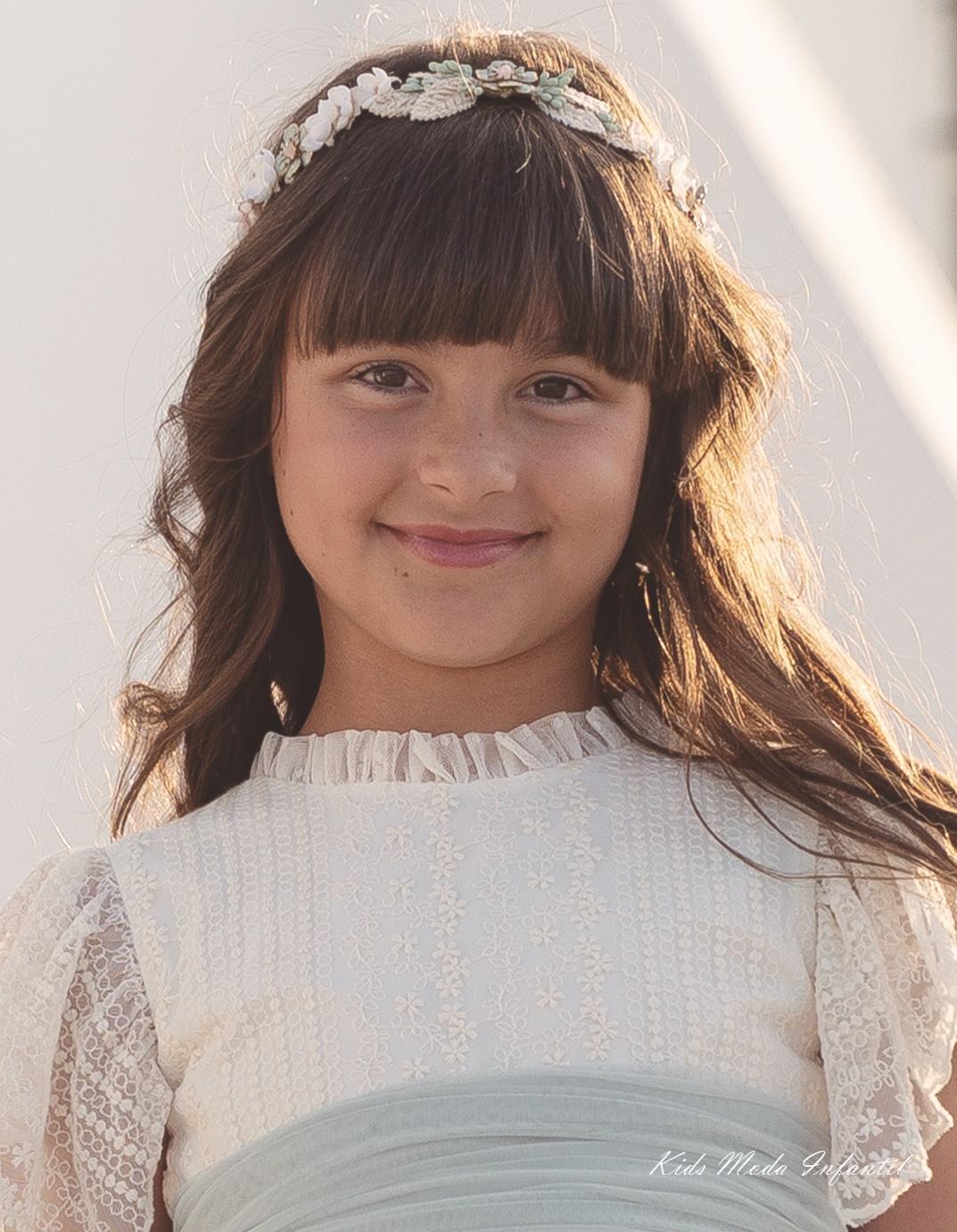 Tiara artesanal de Comunión elaborada con flores en blanco roto y verde agua, perfecta para combinar con el vestido Leandra 2026. Ajustable, cómoda y muy ligera, ideal para peinados románticos de Comunión.