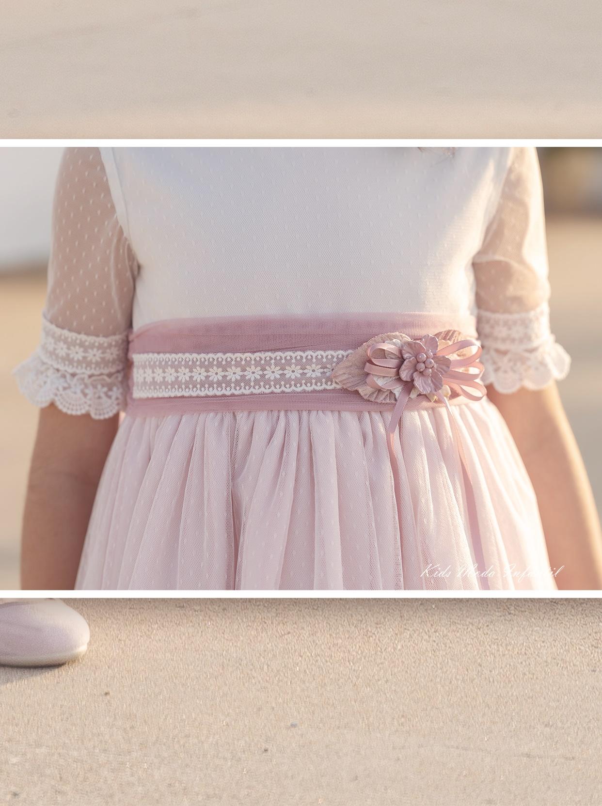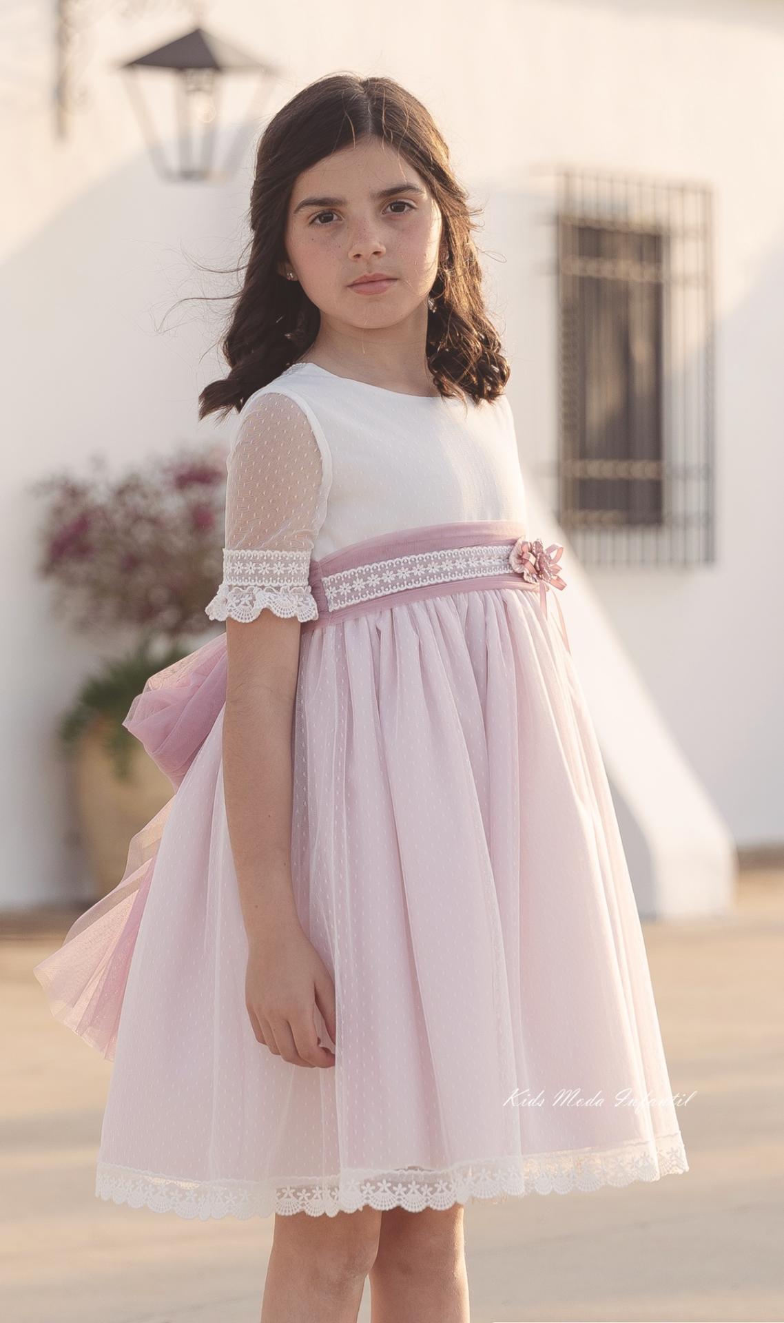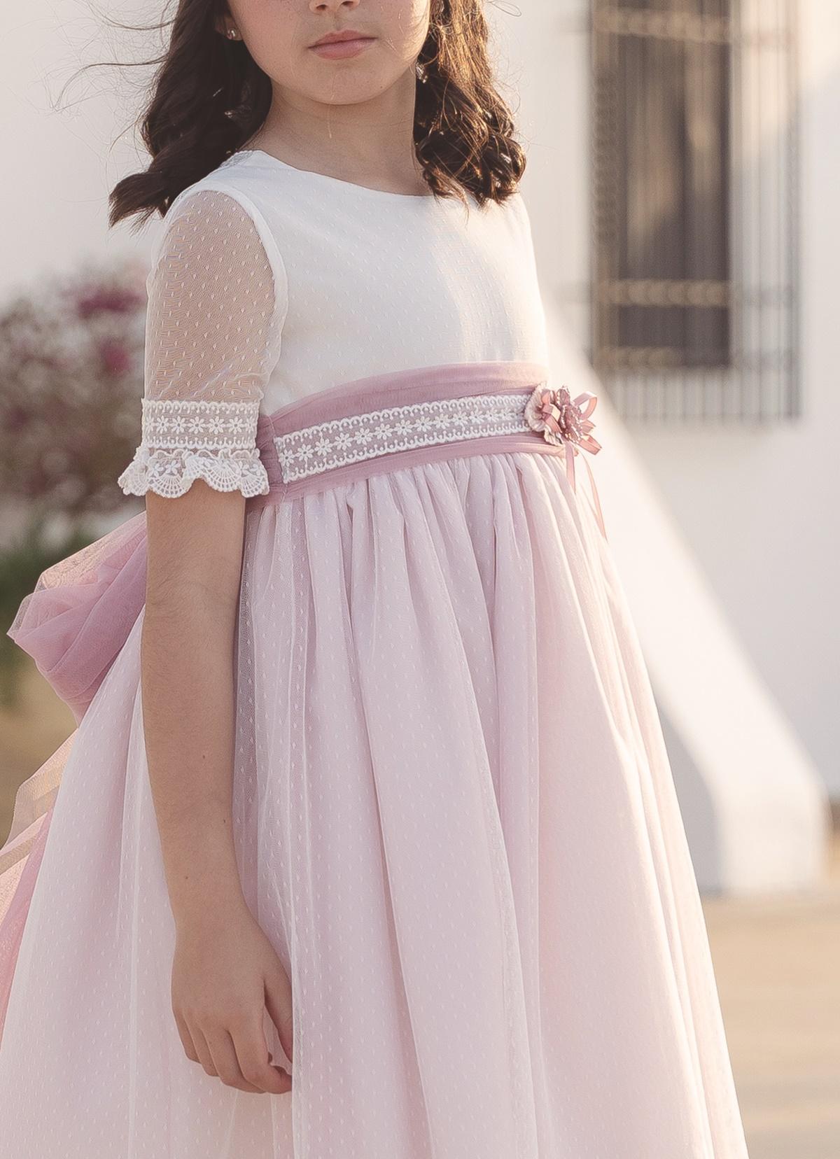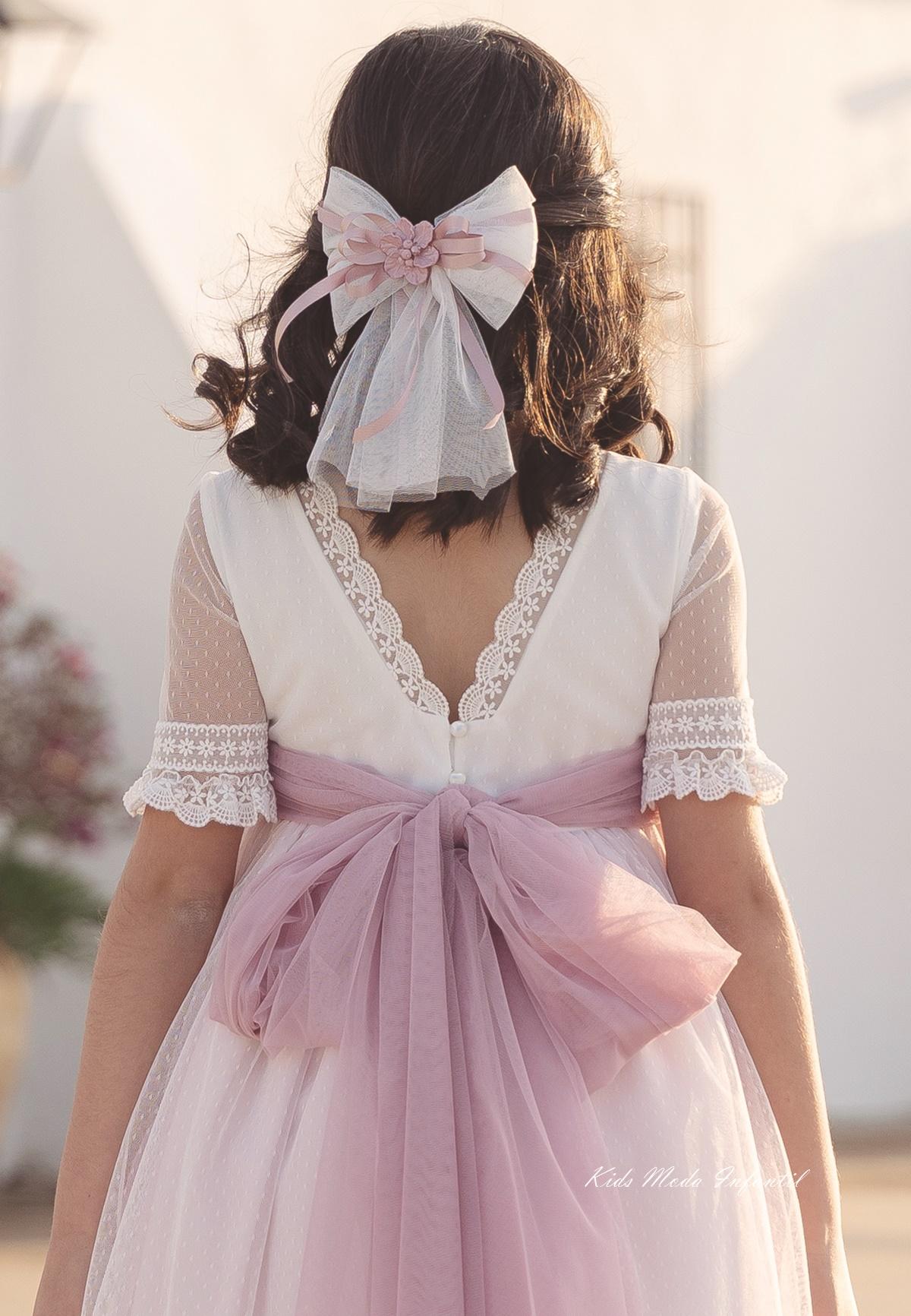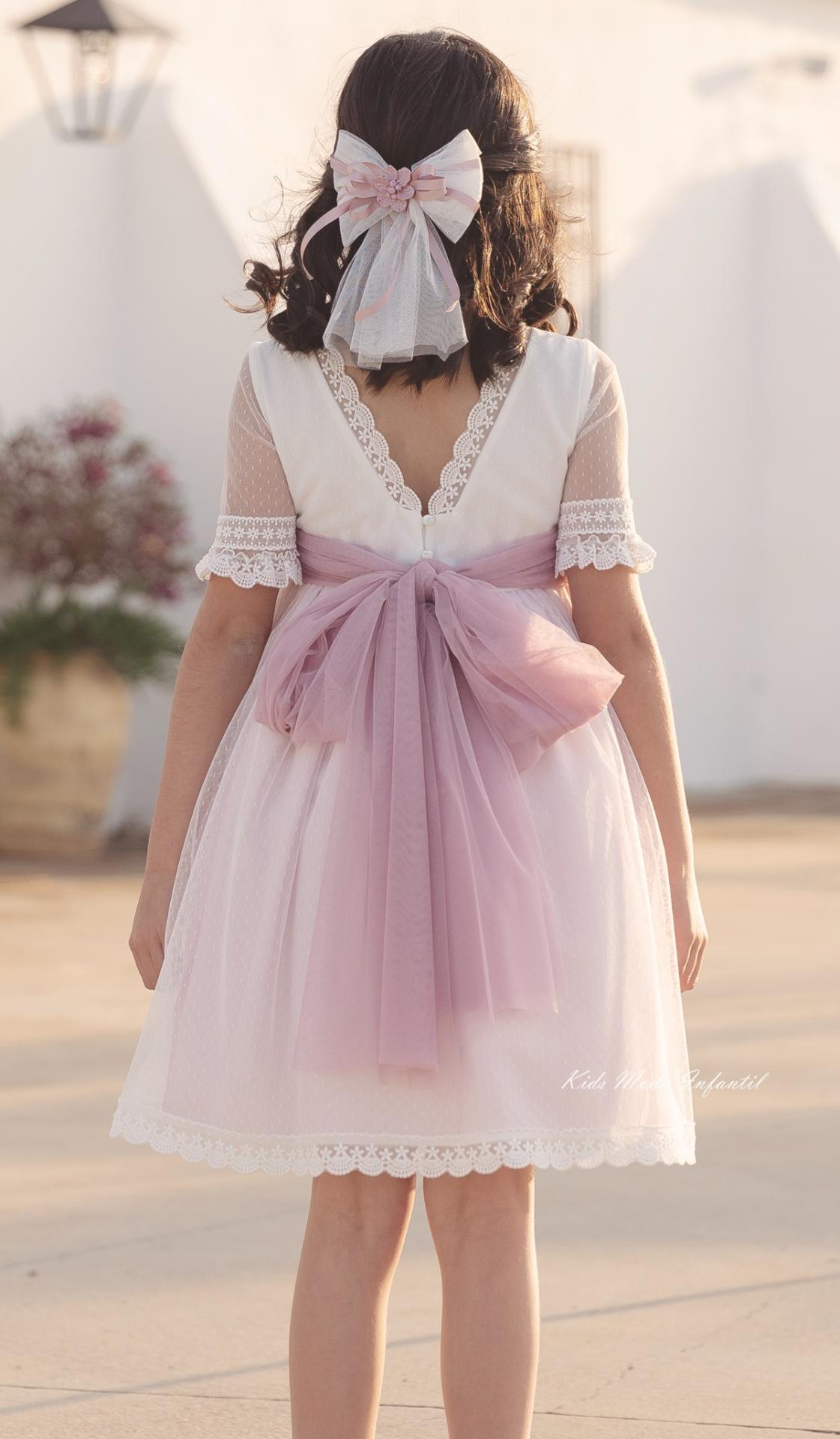 Vestido de Comunión Corto Laly 2026 Eva Martínez Artesanía – Tul Blanco Roto y Fajín Rosa Lila