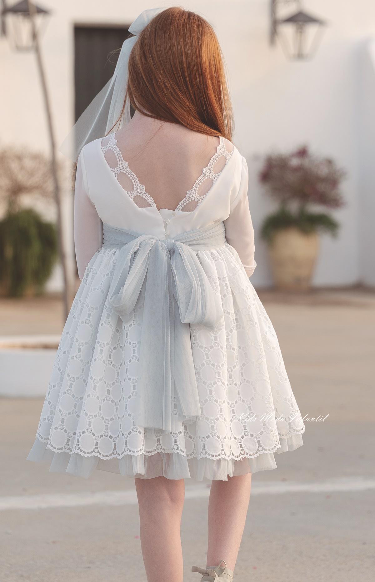 Confeccionado en un delicado tejido de gasa perforada blanco roto, combina una falda con volumen suave y caída ligera con tul verde agua, aportando un toque fresco, elegante y muy actual. El escote destaca por su diseño romántico y elaborado, que realza la dulzura del look sin perder la esencia clásica de la comunión.