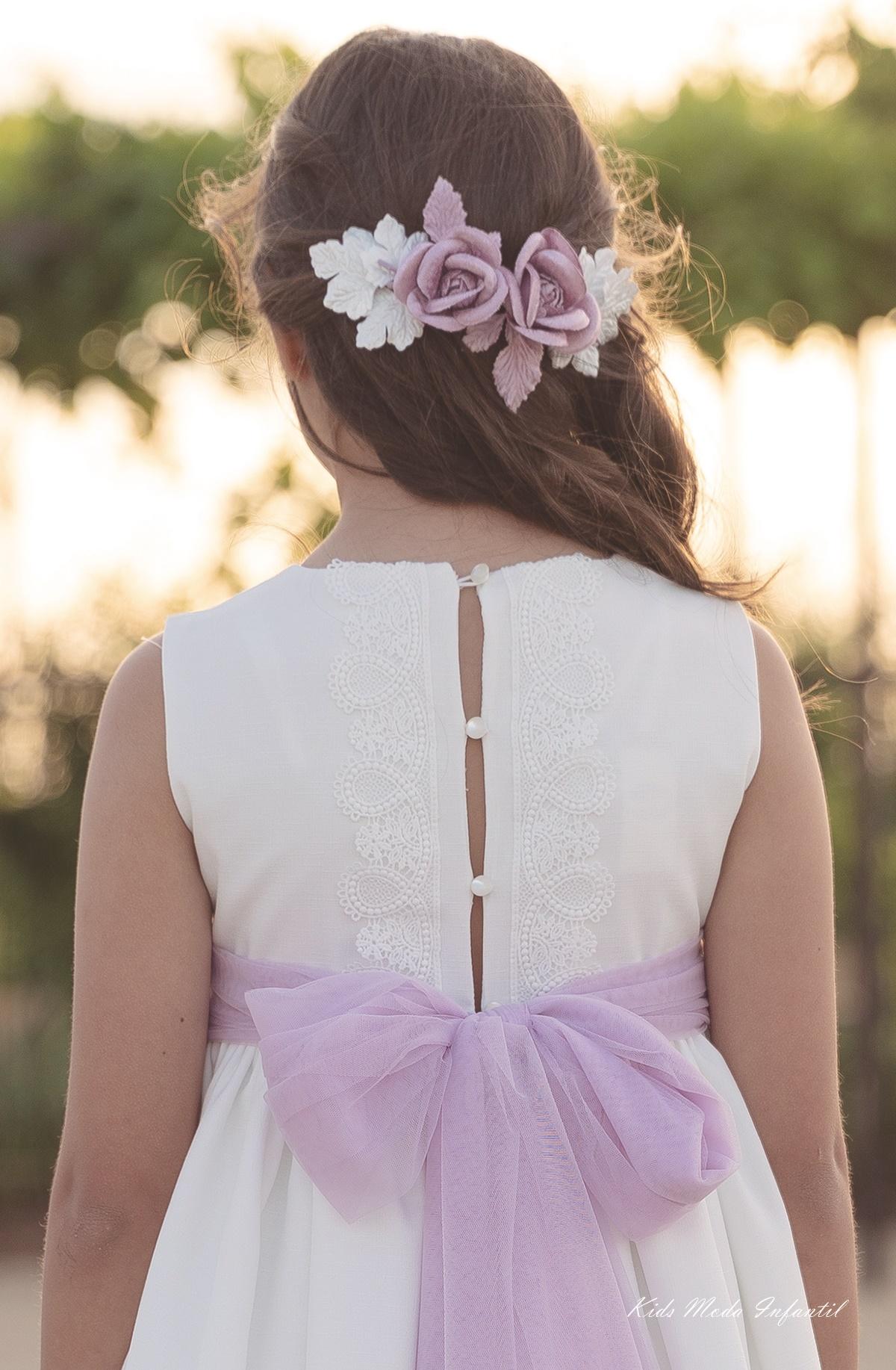 Tocado de Comunión Flores Letizia 2026 de Eva Martínez Artesanía, elaborado a mano con flores lila y blancas. Un complemento elegante y delicado que combina perfectamente con el vestido Letizia. Disponible en Kids Moda Infantil.