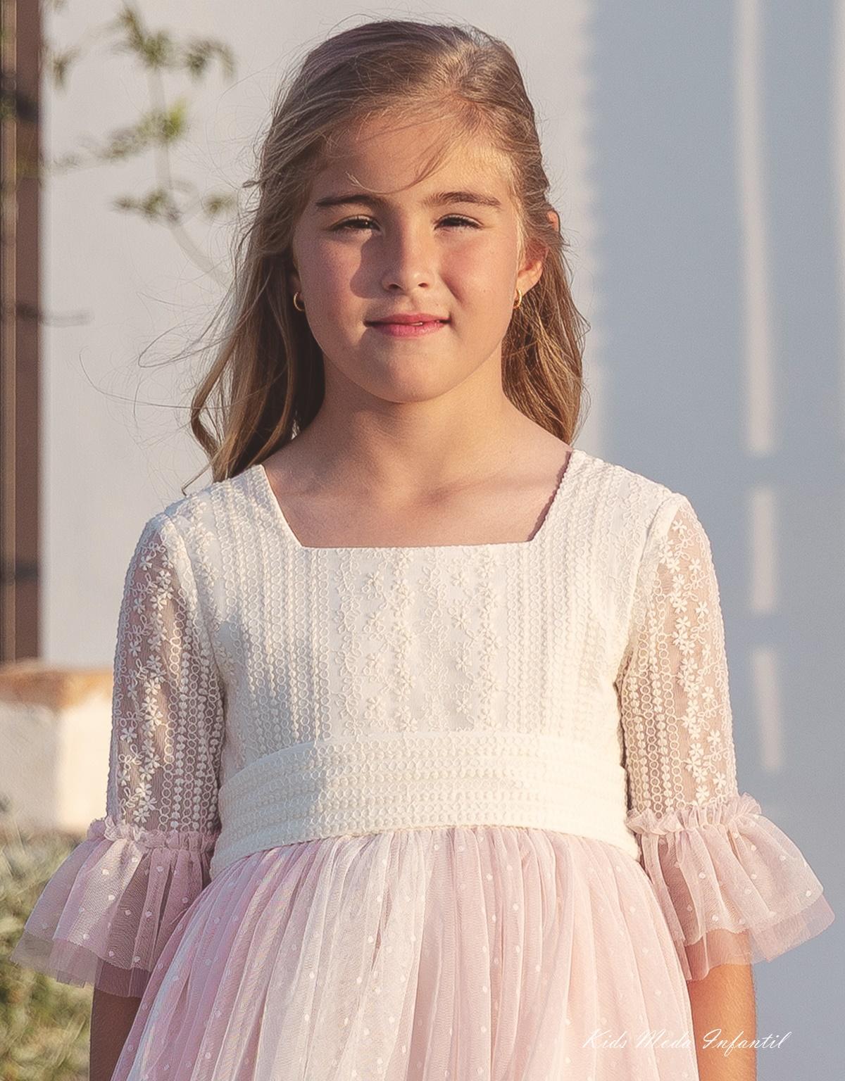 Vestido de Comunión Corto LISA 2026 en Tul Bordado y Rosa Empolvado – Eva Martínez Artesanía