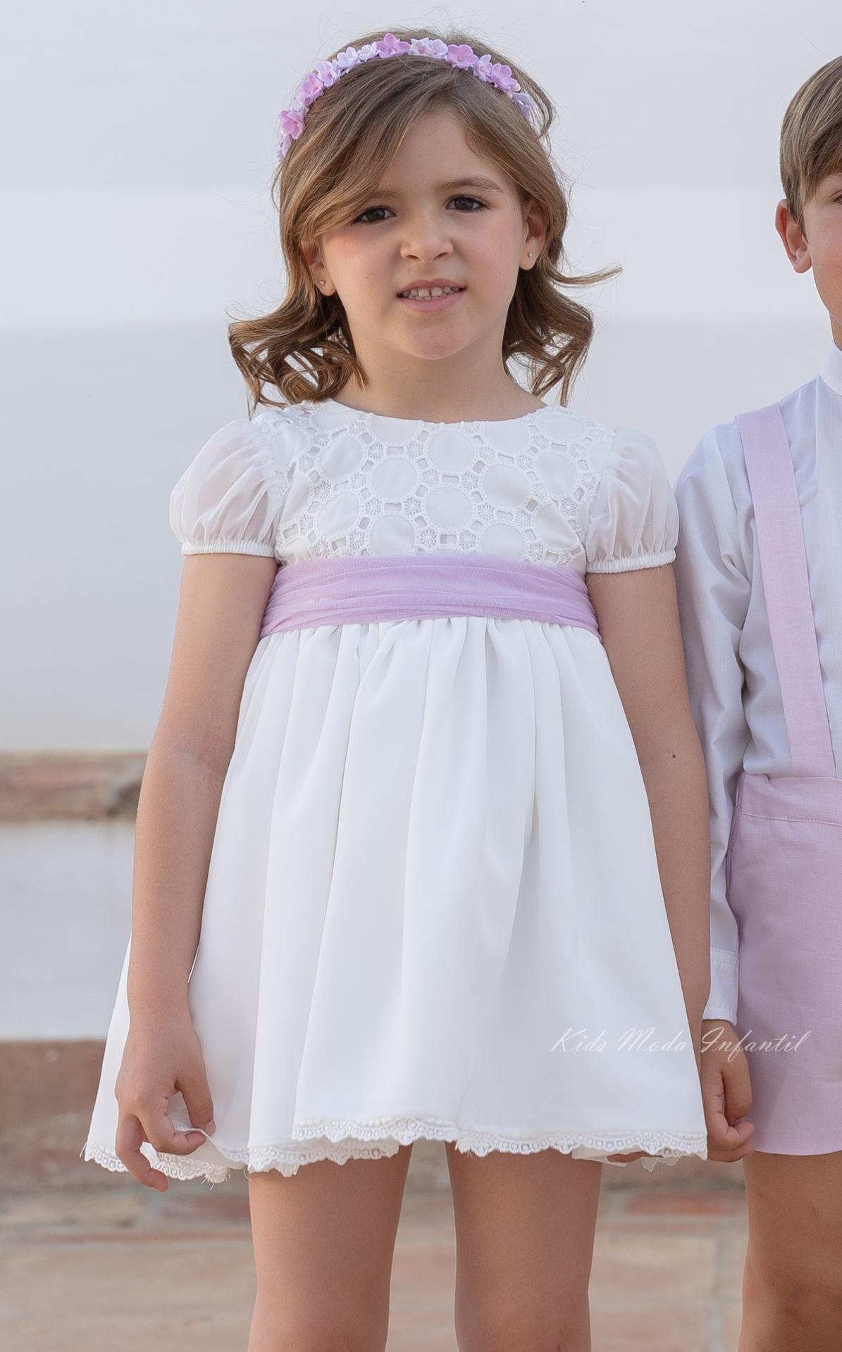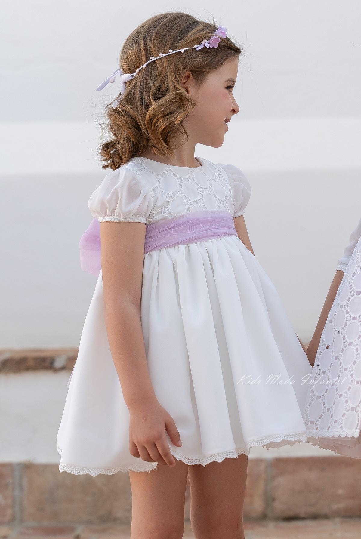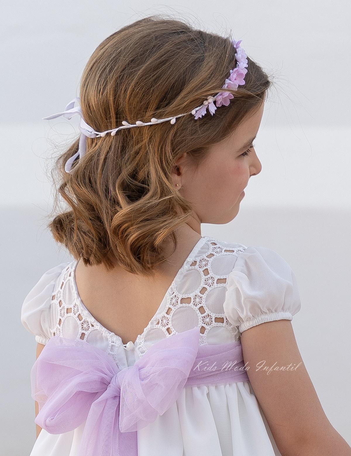 Vestido de Ceremonia y Arras Niña Eva Martínez Artesanía en Gasa Bordada con Lazo Lila