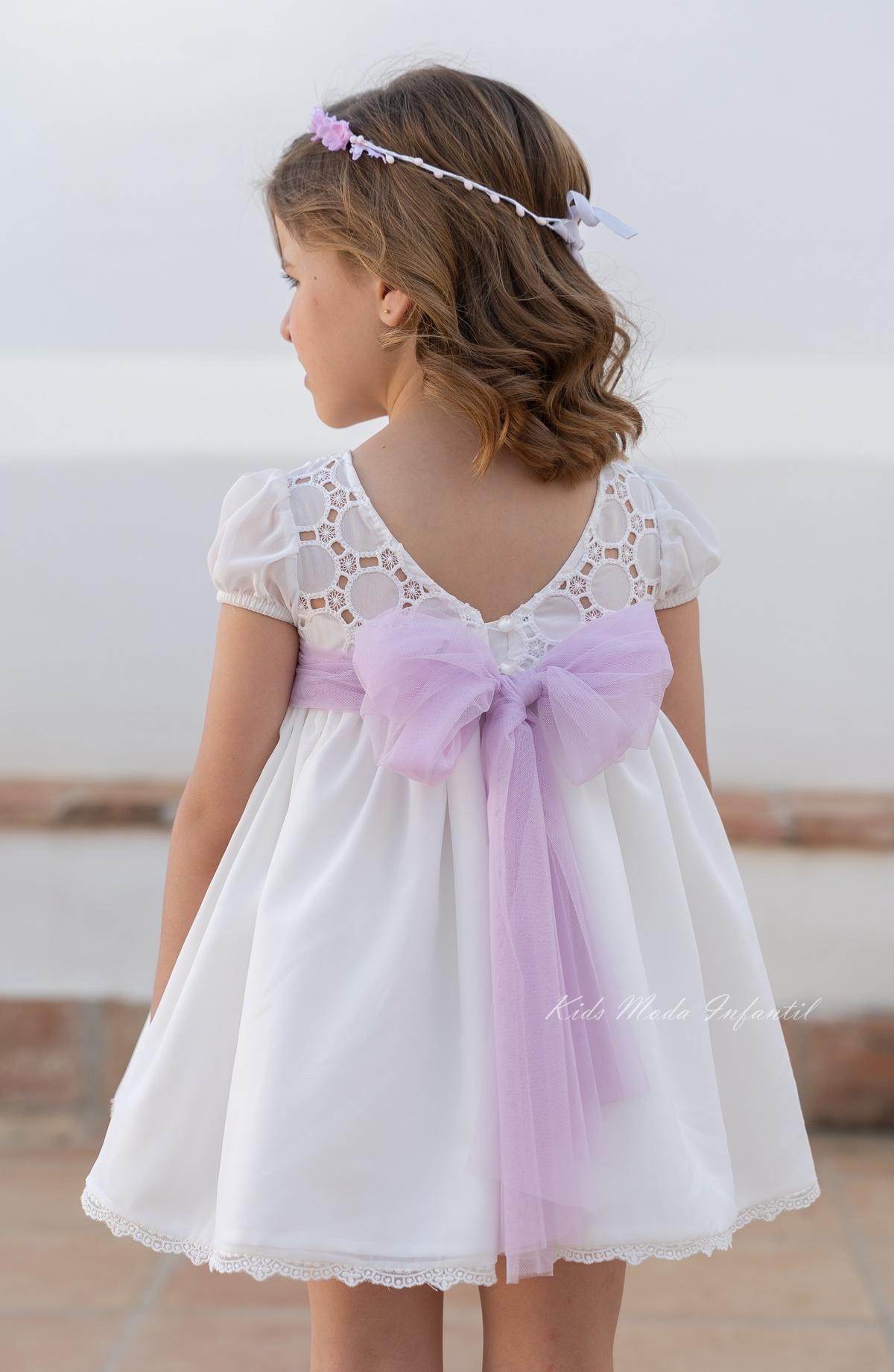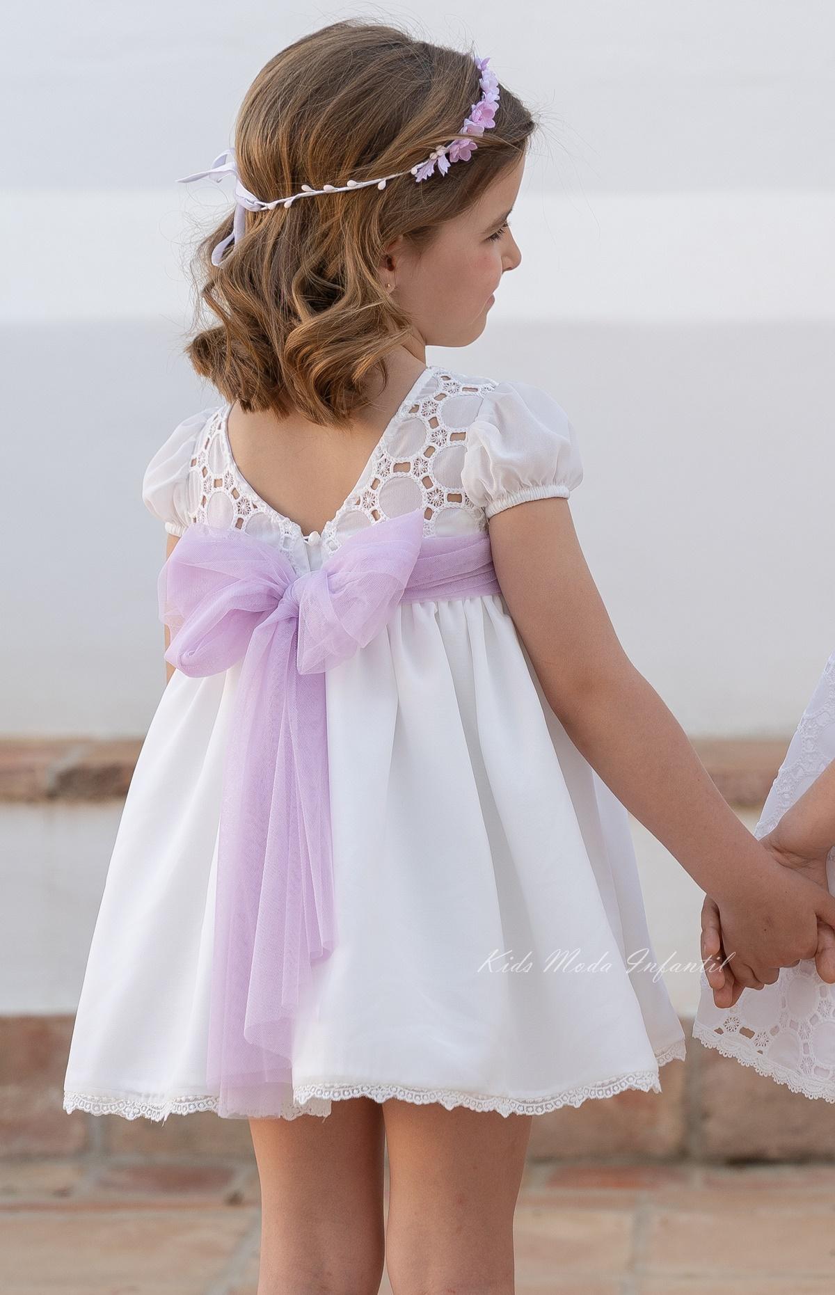 Tu pequeña princesa deslumbrará con este precioso y elegante vestido niña vestir de arras o ceremonia y con su corona flores lila a juego.