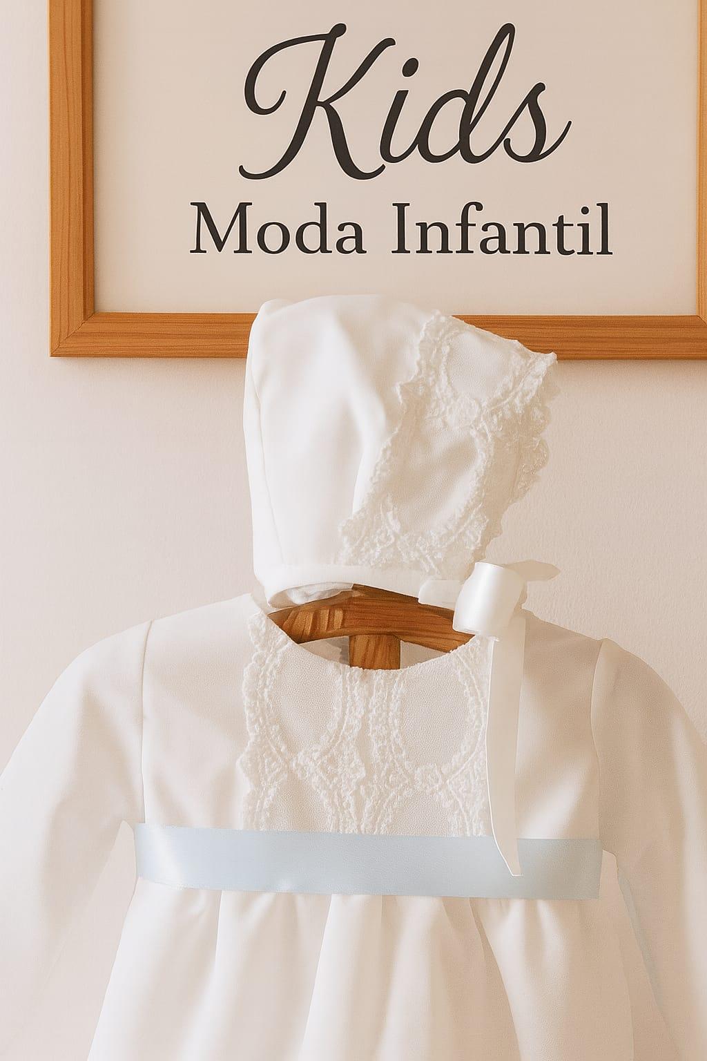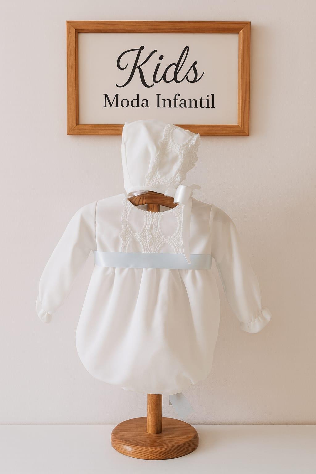 Este elegante pelele de bautizo blanco en gasa con cinta azul, diseñado por Eva Martínez Artesanía, es una prenda exclusiva disponible en Kids Moda Infantil. Confeccionado de manera artesanal, destaca por su tejido suave y ligero, ideal para ceremonias especiales como bautizos, presentaciones o sesiones fotográficas.