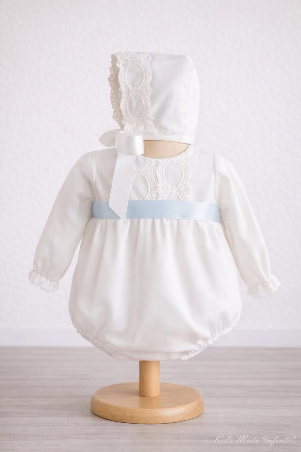 El pelele presenta manga larga, delicados detalles bordados en el pecho y un acabado impecable que aporta un estilo clásico y atemporal. La cinta azul satinada añade un toque distintivo y dulce, aportando contraste sin perder la armonía del diseño. Incluye además una capota a juego, elaborada con la misma gasa y encajes finos, que complementa perfectamente el conjunto.