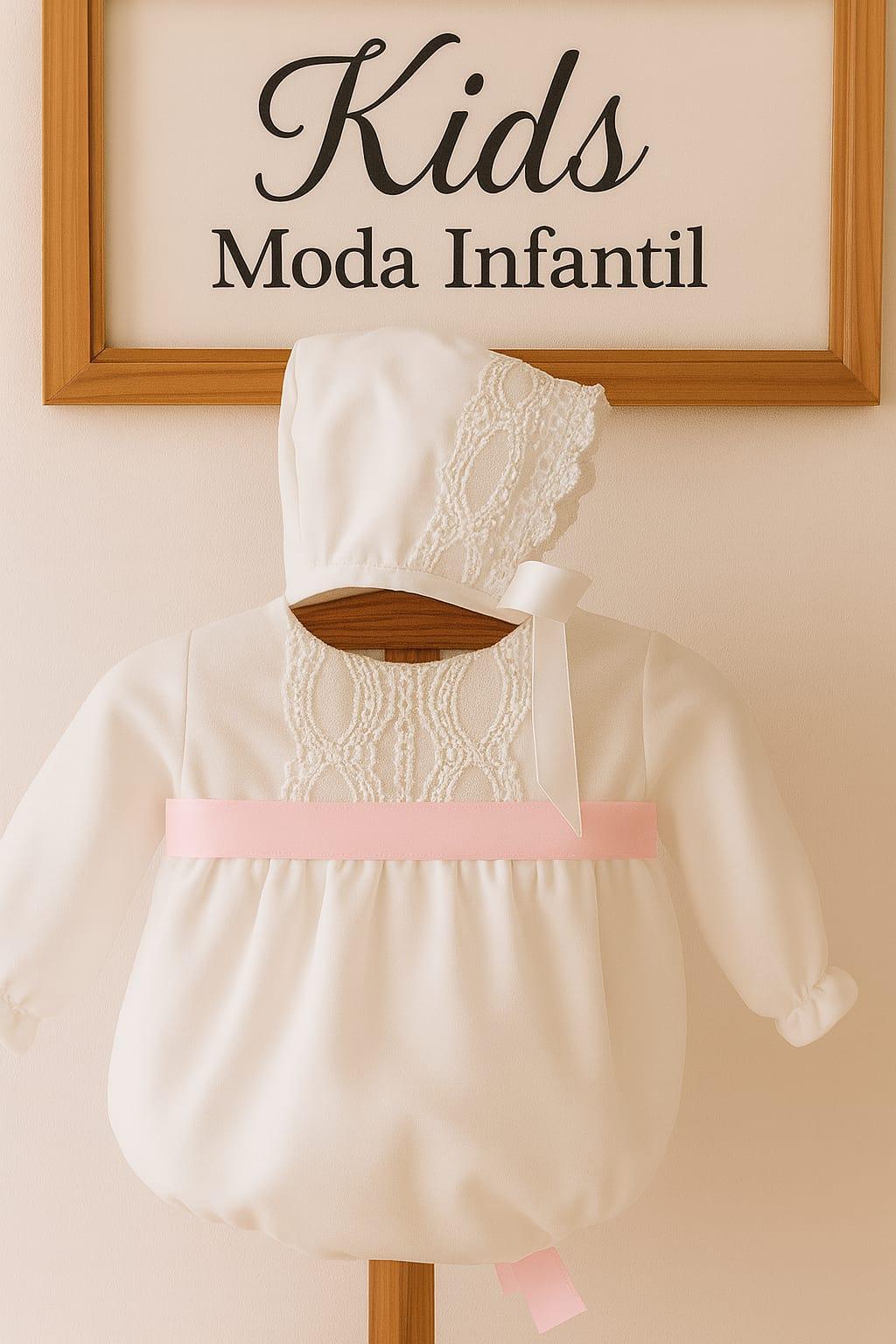 El pelele está confeccionado en gasa blanca de alta calidad, con manga larga y un primoroso bordado en el delantero que aporta textura y un toque clásico. La cinta rosa bebé en raso, suave y luminosa, añade un matiz dulce y elegante al conjunto, aportando ese toque especial tan característico de las prendas de ceremonia. Incluye además una capota a juego, elaborada con encajes finos, que completa un look armonioso y lleno de encanto.