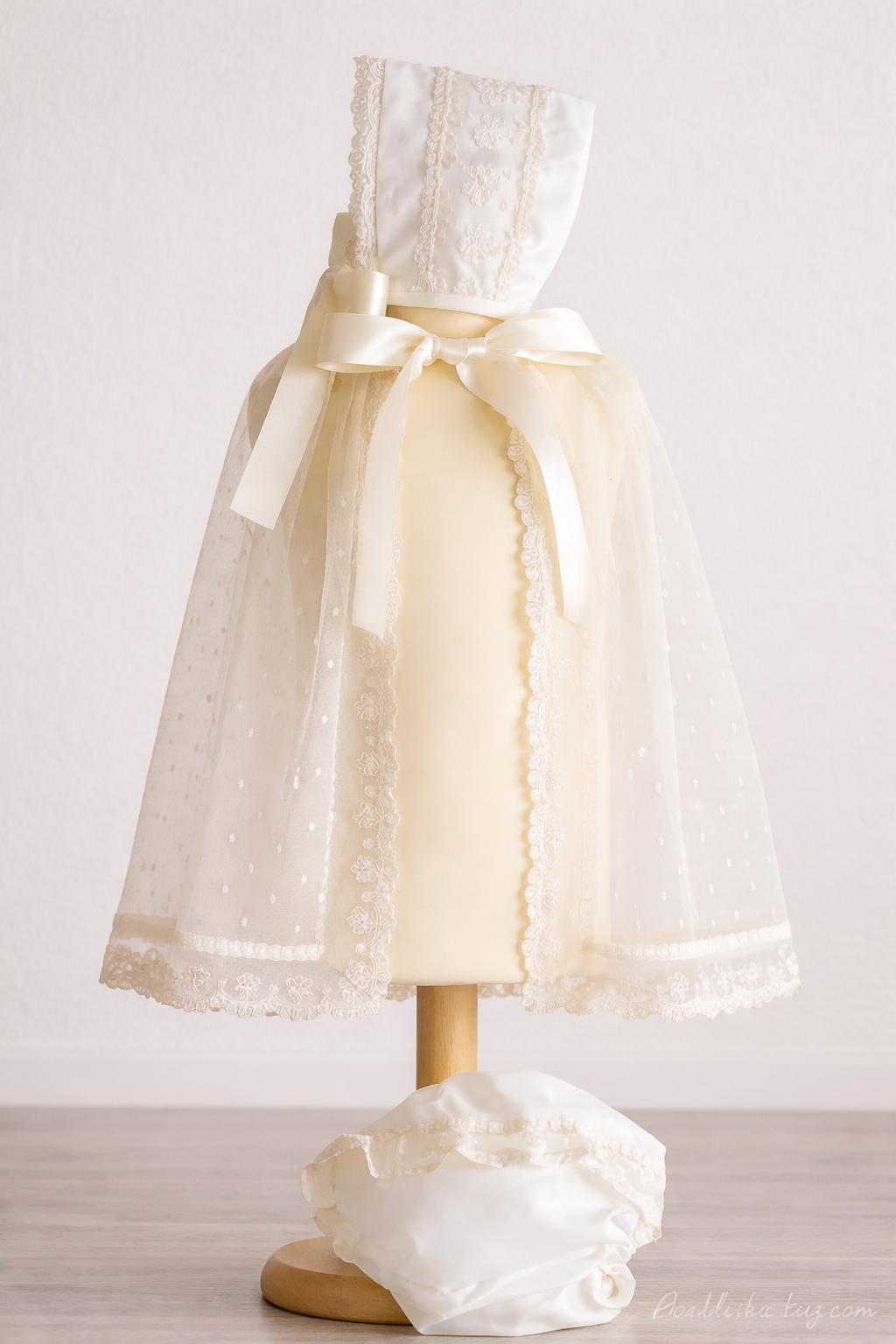 Pelele de bautizo bebé en tul beige con topos y puntillas bordadas – Eva Martínez Artesanía