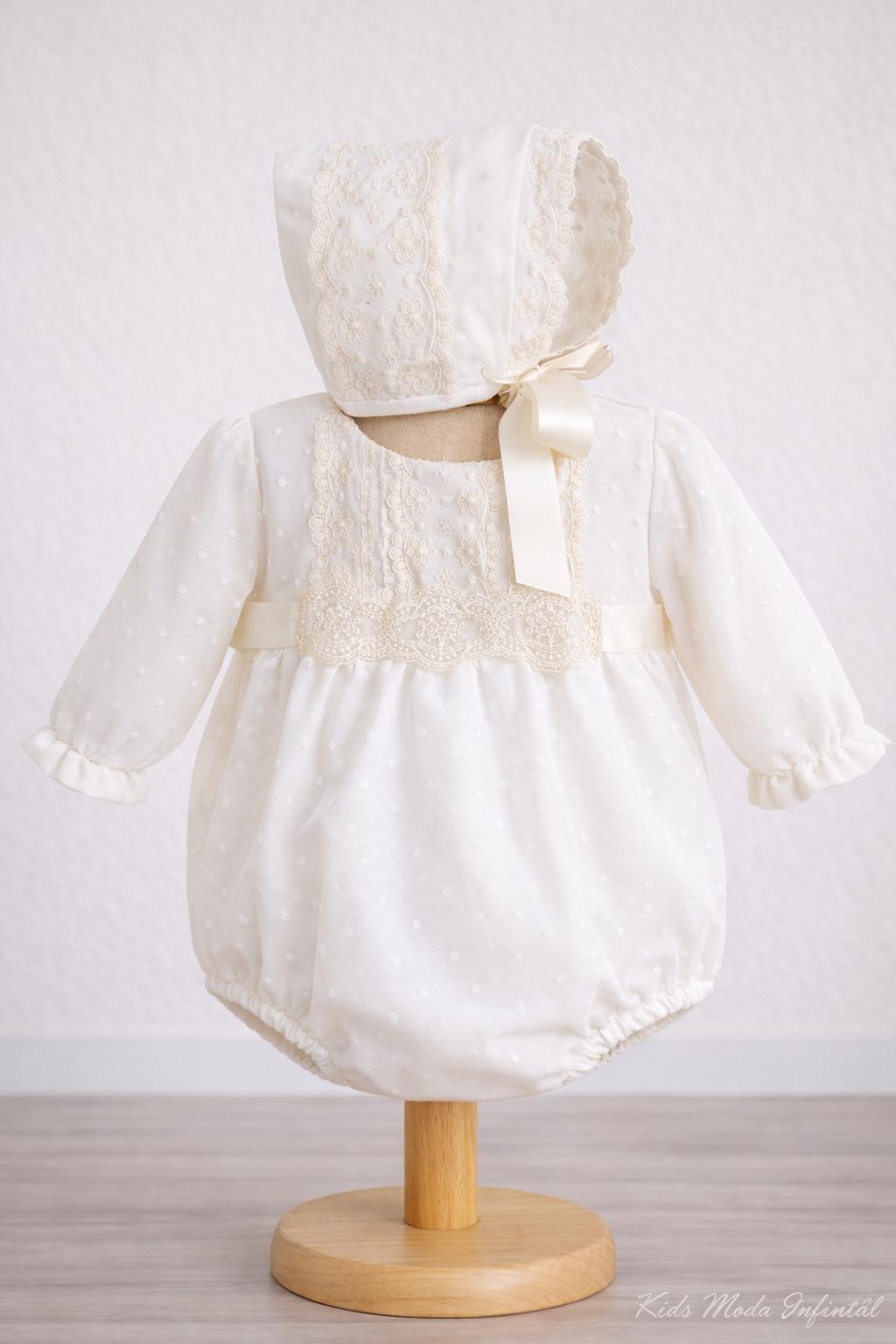 El cuerpo y el delantero están decorados con finas puntillas bordadas en tono marfil, aportando un aire clásico y atemporal. Sus mangas largas y su patrón cómodo garantizan libertad de movimiento y bienestar para el bebé durante toda la celebración.