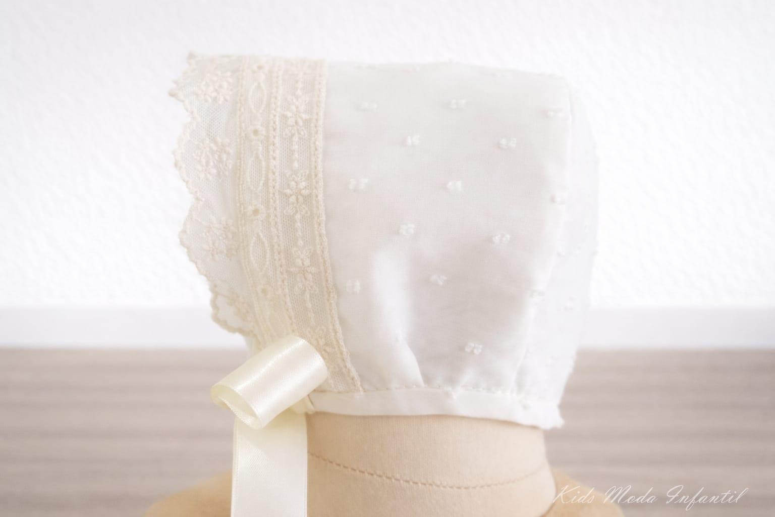 El conjunto incluye una capota a juego, elaborada también en tul con plumeti de cristal y puntillas bordadas en el lateral, que se ajusta mediante lazada para completar un look ceremonial impecable.