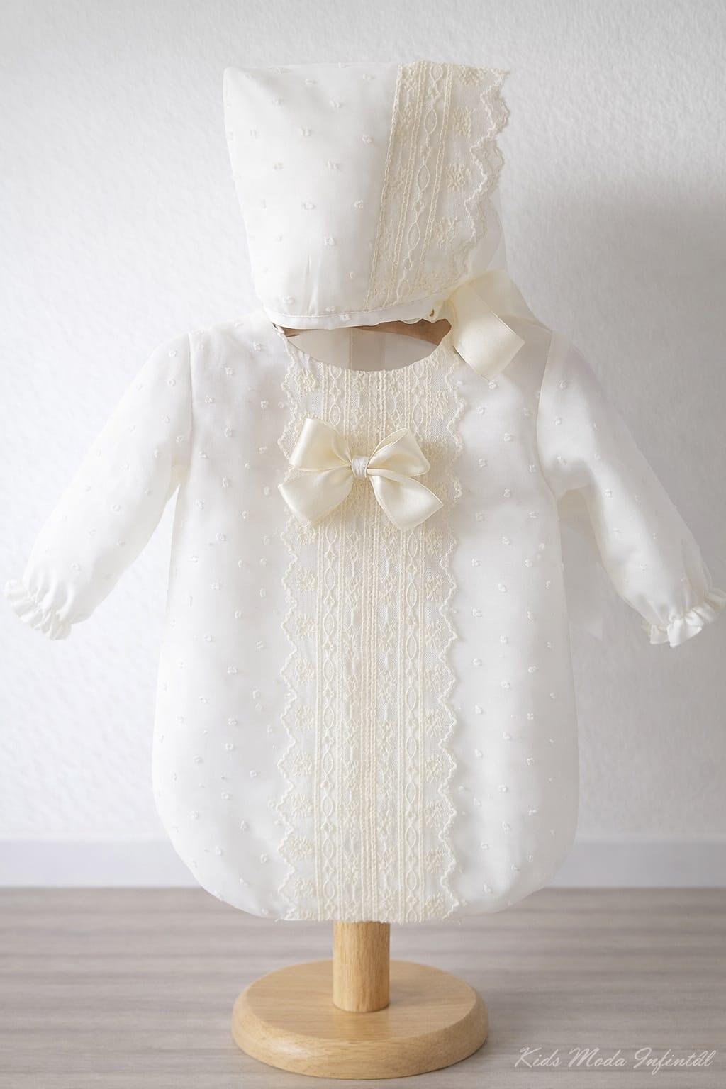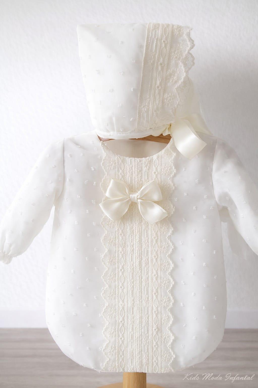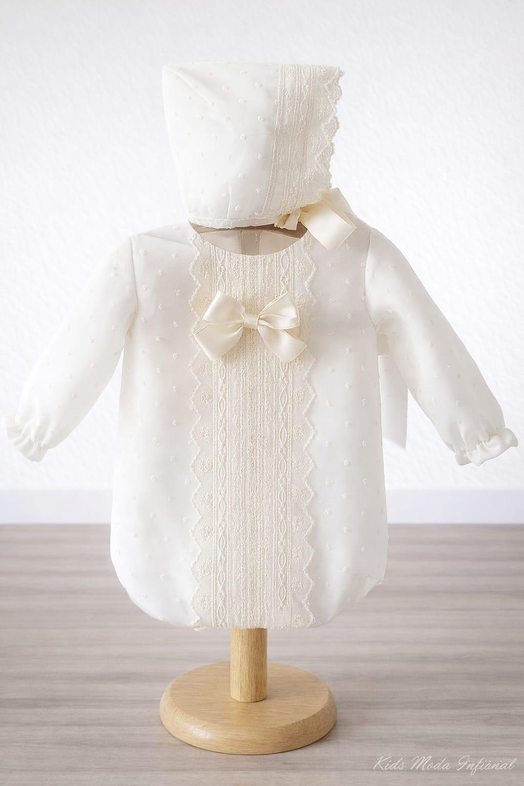 Si quieres tener el conjunto de bautizo bebe al completo añade al carrito el pelele bautizo de bebe y añade su capota a juego. Colección Familia 7 Eva Martínez Artesanía.